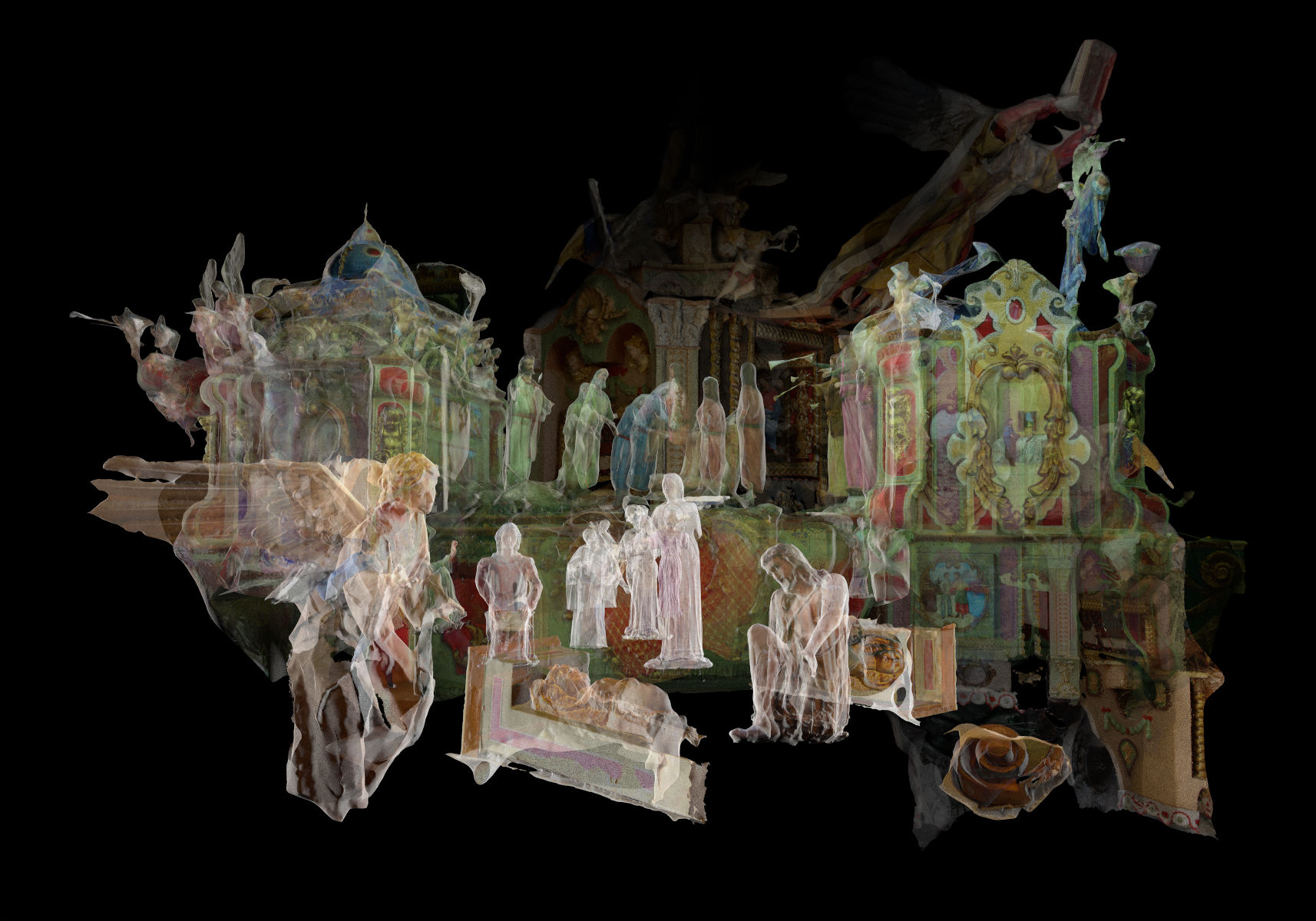 In mostra, negli spazi all’interno di Fabbrica del Vapore a Milano, il mediometraggio prodotto da Careof e da Invisibile Film che analizza e racconta proprio questo fenomeno, accompagnato da una serie di materiali d’archivio raccolti dall’artista nei mesi di lavoro in Basilicata e da un ciclo di immagini realizzate con la tecnica della fotogrammetria, una tecnologia in grado di generare modelli tridimensionali a partire da fotografie realizzate attorno a un soggetto centrale. In questo senso, Caterina Erica Shanta ha raccolto per anni, attraverso open call, le fotografie scattate dal pubblico con il proprio cellulare nella piazza principale di Matera durante il momento cardine della festa, ovvero la distruzione - o ‘strazzo’ - del carro trionfale a opera della popolazione. Nel momento in cui il carro sparisce demolito da migliaia di braccia, altrettante scattano fotografie: inconsciamente realizzano una fotogrammetria a 360° quasi perfetta del soggetto centrale ormai distrutto.