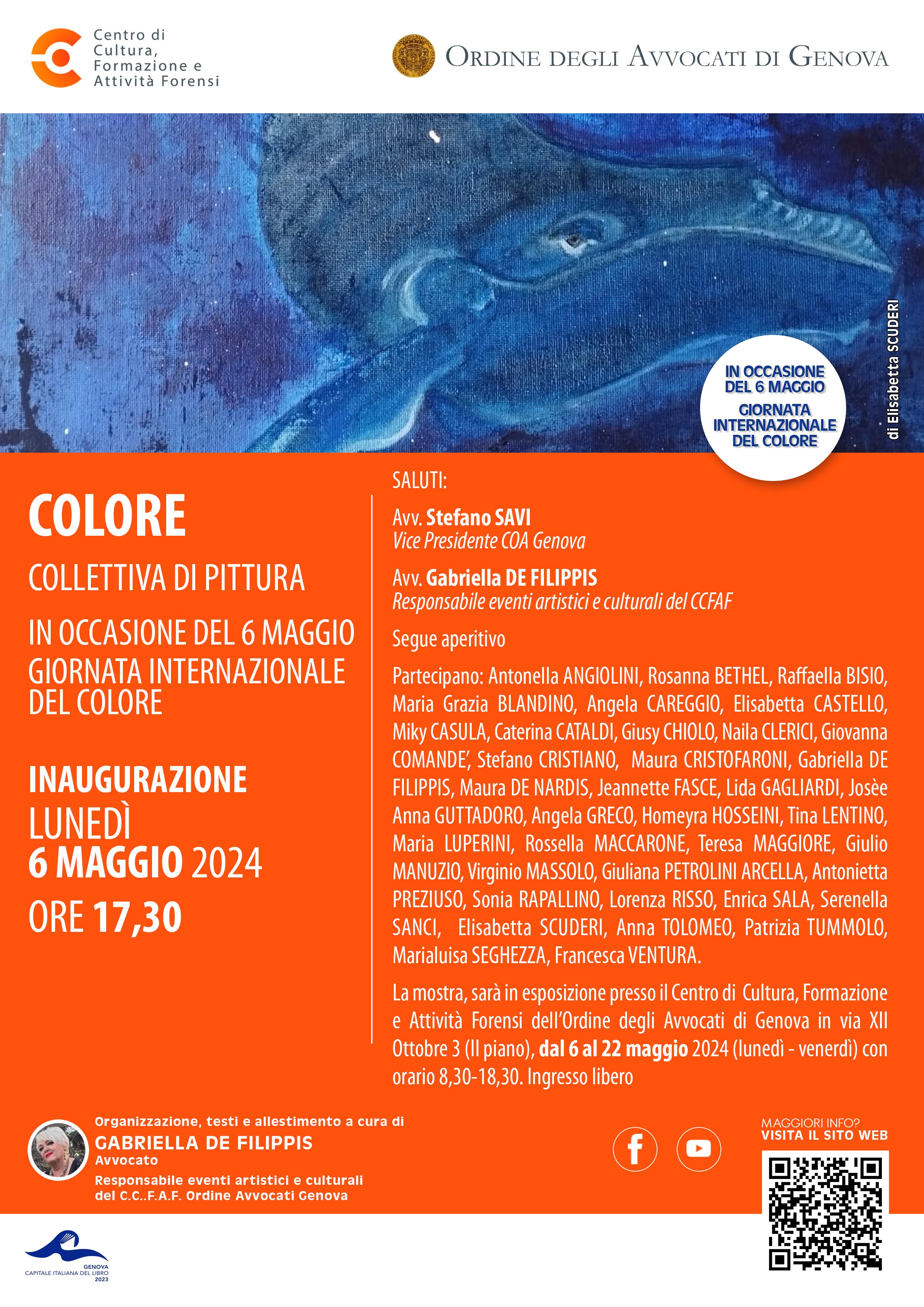 Il 6 maggio, in occasione della giornata internazionale del colore, meglio nota come World Kids Colouring Day, alle ore 17,30, nei locali del Centro Cultura Formazione e Attività Forensi, in via XII ottobre 3, sarà inaugurata la mostra IL COLORE, alla quale hanno partecipato più di trenta artisti con opere di medio formato.