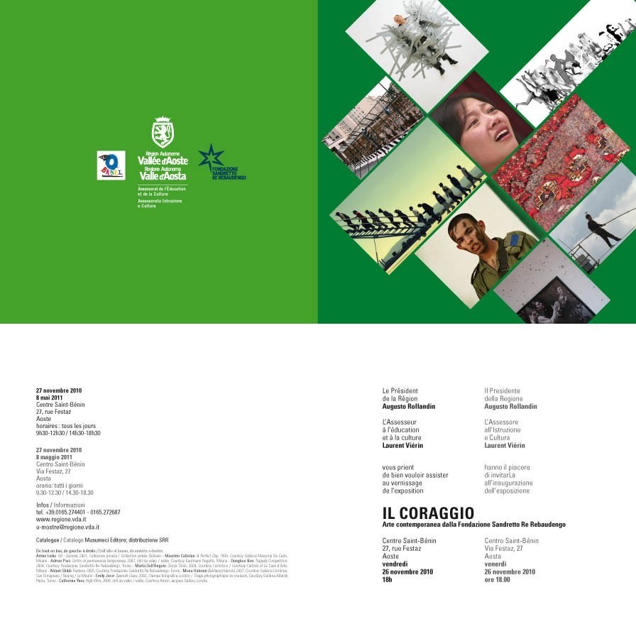 L'Assessorato Istruzione e Cultura della Regione autonoma Valle d'Aosta, promuove e realizza in collaborazione con laFondazione Sandretto Re Rebaudengo, dal 26 novembre 2010 al 8 maggio 2011, la mostra “Il Coraggio. Arte Contemporanea dalla Fondazione Sandretto Re Rebaudengo” (Centro Saint-Bénin, Via Festaz 24 -Aosta). L'esposizione, presentata da Francesco Bonami, Direttore Artistico della Fondazione Sandretto Re Rebaudengo, e curata da Ilaria Bonacossa, riunisce le opere di venti artisti internazionali: Letizia Battaglia (Palermo, 1935), Rossella Biscotti (Molfetta-Bari, 1978), Maurizio Cattelan (Padova, 1960), Marta Dell’Angelo (Pavia, 1970), Donghee Koo (Corea del Sud, 1974), Lara Favaretto (Treviso, 1973), Nan Goldin (U.S.A., 1953), Massimo Grimaldi (Taranto, 1974), Mona Hatoum (Libano, 1952), Jenny Holzer (U.S.A., 1950), Emily Jacir (Palestina, 1970), Armin Linke (Milano, 1966), Alessandro Mancassola e Barbara Ceriani Basilico (collettivo formatosi nel 2005), Catherine Opie (U.S.A., 1961), Anri Sala (Albania, 1974), Hans Schabus (Austria, 1970), Ahlam Shibli (Palestina, 1970), Mario Spada (Napoli, 1971), Cathrine Yass (UK, 1963).