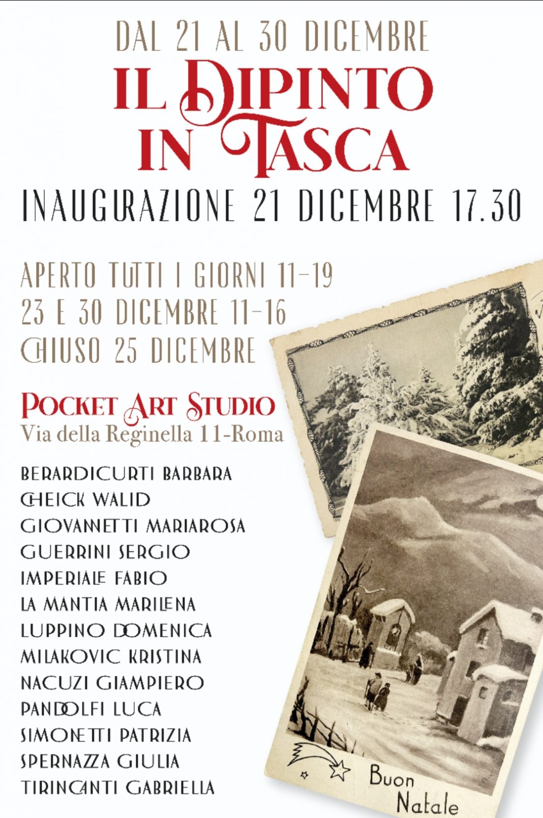 Come tutti gli anni la Pocket Art Studio organizza la mostra del piccolo formato. Una selezione di artisti con piccoli dipinti. Lo scopo della mostra è quello di proporre la bellezza di piccole ma “grandi” opere che restano per sempre, messaggi di pace, per un Natale all’insegna del colore.