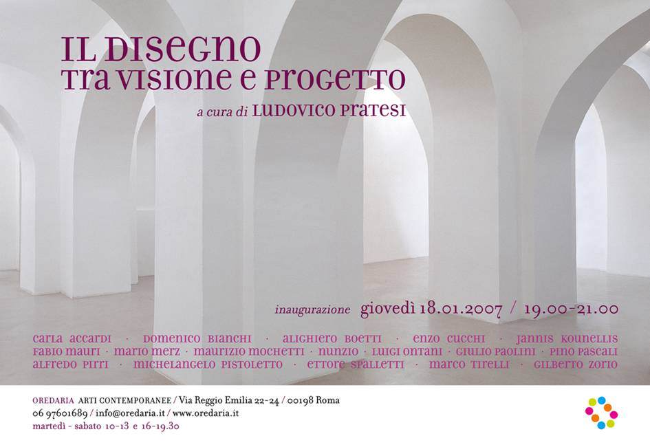 Questa mostra intende analizzare questi due aspetti del disegno contemporaneo,che corrono autonomi e paralleli nell’arte italiana dagli anni sessanta ad oggi. Il disegno inteso come visione, praticato da artisti che privilegiano il lato poetico ed espressivo dell’opera, o il disegno inteso come progetto nell’operato di artisti di matrice concettuale, punto di partenza imprescindibile per una poetica legata alla dimensione mentale dell’opera. Ogni artista è rappresentato in mostra da un lavoro particolarmente significativo del suo rapporto personale col disegno, dichiarato dalle brevi interviste agli artisti, pubblicate nel catalogo della mostra , edito da Skira./Oredaria