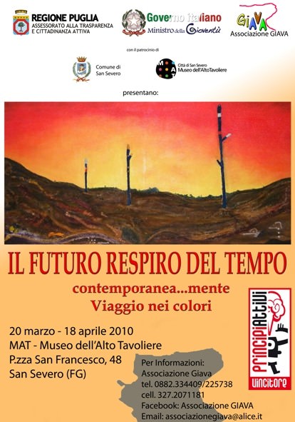 Sarà inaugurata sabato 20 marzo 2010, alle ore 18.30, presso il MAT - Museo Alto Tavoliere di San Severo (FG), la mostra d’arte contemporanea “Il futuro respiro del tempo… Contemporanea…mente - Viaggio nel colore”, ideata e curata dall’Associazione Giava, con i fondi ottenuti dalla Regione Puglia in qualità di progettisti vincitori di "Bollenti Spiriti", programma della Regione per la Politiche Giovanili.