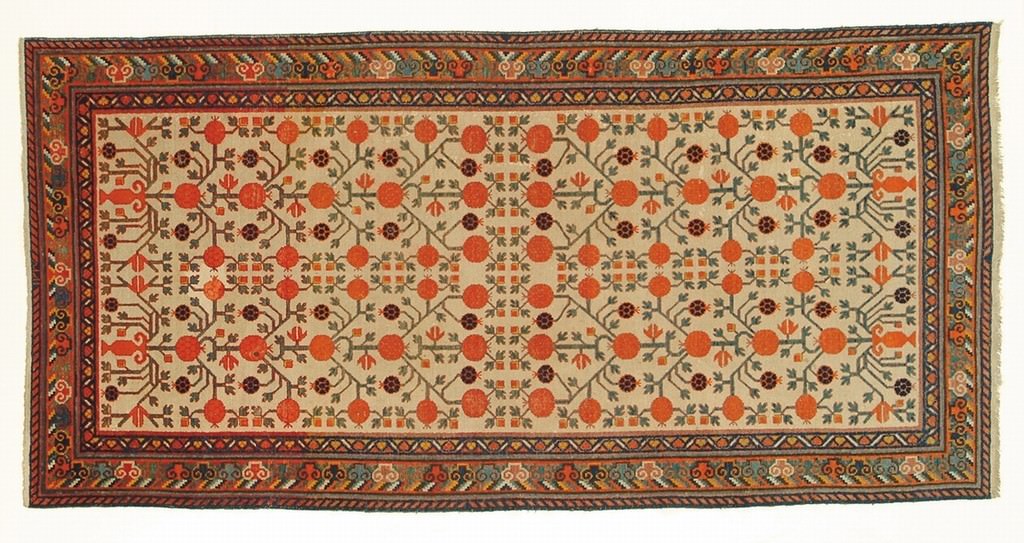 Questa cultura spirituale fu diffusa dai mercanti ebrei sefarditi attraverso l’arte del tappeto, in un percorso millenario che li condusse da Granada alle terre dell’impero ottomano fino all’Estremo Oriente. I mercanti sefarditi giunti nelle Oasi del Turkestan nel XVIII secolo furono gli eredi di questo straordinario dinamismo spirituale e commerciale. Nei testi cabbalistici, il melograno e l’albero della vita rappresentano la sfera legata al divino. Ed ecco il tappeto Albero della Vita a rappresentare il programma della creazione dei mondi, e il Giardino dei Melograni, simbolo e affermazione di fede.