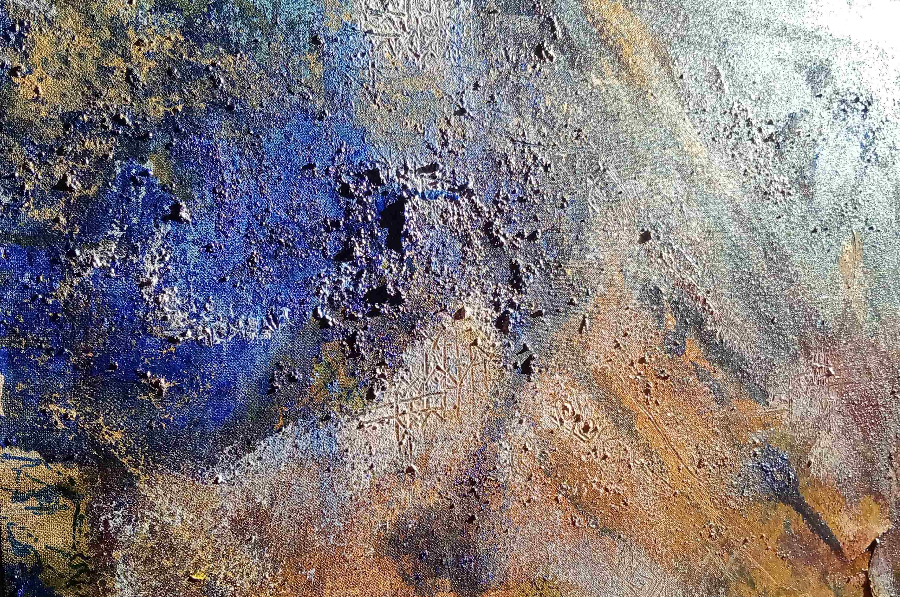 Tempo e movimento costruiscono il mistero dei lavori di Antonella Rossetti nel turbinio delle acque de “Il tuffatore”, resa dalla spontaneità di vortici che ritornano gli uni sugli altri, in calde cromie “non attese”, e nei diversi tracciati delle opere “nucleari” più recenti dove il movimento è come “frenato” dalla corrosione-trasformazione della materia, resa da interventi ricorsivi che arrivano, alla maniera di Fontana, e graffiare e tagliare la tela, mentre il colore, rivelato dalla luce, irrompe anche violentemente a ipostatizzare sentimenti transitori. È la serie “Le rughe del tempo”, nelle parole dell’autrice: “tracce che cercano stratificazioni di luoghi perduti e rughe del tempo che solcano l’animo umano”.