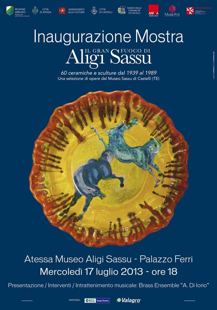 La mostra “Il gran Fuoco di Aligi Sassu” che si inaugura il 17 luglio, giorno della nascita e della morte del grande Maestro, conclude simbolicamente l’itinerario delle celebrazioni del primo centenario della nascita di Sassu (1912-2012), promosse a livello nazionale ed internazionale, con attività culturali significative realizzate anche dalla Fondazione MuseAte all’interno della splendida cornice del Museo Sassu in Palazzo Ferri di Atessa. Con questo percorso espositivo si concretizza un progetto, o meglio un sogno, fortemente motivato e sostenuto dalla generosità di Alfredo Paglione e realizzato con il concorso sinergico di tante realtà e persone, tra cui le curatrici del Museo Sassu Anna Pia Apilongo e Anna D’Intino che con me portano avanti le tante iniziative culturali che movimentano il tessuto sociale della città. Le ceramiche e le sculture esposte nella mostra dialogano vivacemente con i dipinti che arricchiscono l’allestimento museale: la materia plasmata con vigore ed eleganza mutua luci e suggestioni dalle esplosioni di colore, nei cui riverberi si integrano e si ricompongono in unità tutte le sfaccettature della poliedrica personalità artistica di Aligi Sassu. La predominante iconografia del cavallo raccorda ed armonizza scultura, pittura e ceramica e proietta nelle opere l’energia cosmica e primordiale, la fierezza ed il movimento che caratterizzano questa mitica creatura nella realtà e nell’immaginario collettivo. Perché la rappresentazione del cavallo, nella matericità del bronzo o negli smalti levigati della ceramica o nel segno deciso della pittura inondata dal “grido del colore” catalizza l’interesse e la curiosità ed accende nei visitatori di ogni età motivazioni estetiche e spinte emozionali di grande intensità. L’esposizione delle ceramiche e delle sculture rappresenta la tappa più importante e prestigiosa di un lungo percorso didattico-culturale che la Fondazione MuseAte ha programmato e realizzato per celebrare il primo centenario della nascita di Aligi Sassu: il seminario di Paola Ardizzola su “Aligi Sassu ed il milieu internazionale europeo”, tre workshop didattici “A spasso con Sassu” per bambini delle scuole elementari, lo spettacolo “Musica, arte e poesia” a cura del Maestro Domenico Galasso. Oggi, allo scadere dell’anno centenario, la mostra “Il Gran Fuoco di Aligi Sassu” rifocalizza l’attenzione sull’immensa produzione artistica di uno dei più grandi Maestri del XX secolo.