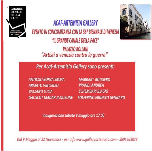 Acaf-Artemisia Gallery di Bergamo è presente con otto artisti, otto validissimi artisti che hanno avuto l’onore di essere scelti per essere inseriti in questa grande vetrina di altissima qualità. La mostra avrà termine il 22 novembre , e durante tutto questo periodo il pubblico che visiterà la Biennale potrà ammirare anche l’arte racchiusa in questo Palazzo. L’inaugurazione , sabato 9 Maggio alle ore 17,00