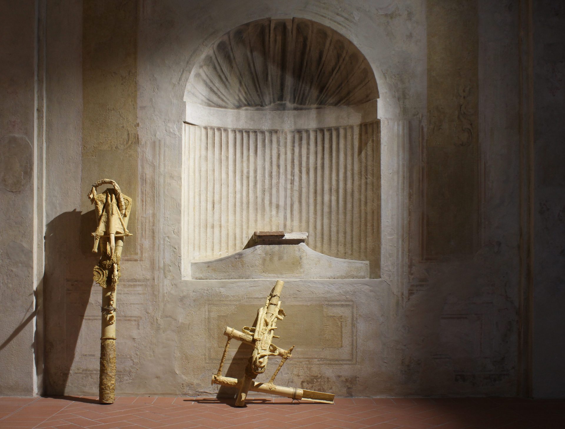 Fabio De Meo, con Formiche, realizza, in una tela dalla superficie pittorica monumentale di 48 metri quadrati, l’organizzazione delle formiche, evidenziandone le strategie sociali e militari come metafora perturbante delle dinamiche umane di dominio e sopravvivenza. La tensione tra costruzione e dissoluzione emerge con forza nelle opere di Cristiano Zanini, che modella la cartapesta in forme evocative di strumenti, tra armi e utensili rituali, suggerendo un dialogo ancestrale tra il corpo e l’oggetto.
