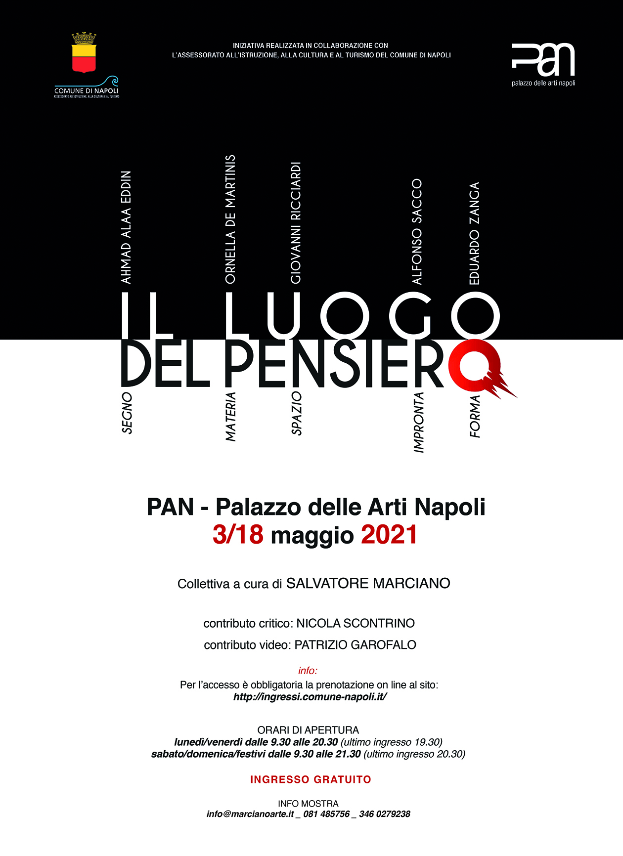 Per le restrizioni imposte dall’emergenza sanitaria da Covid-19, la mostra non prevede un vernissage ma è accessibile e visitabile negli orari di apertura del PAN previa prenotazione obbligatoria – che richiede pochi passaggi e pochi secondi – al sito http://ingressi.comune.napoli.it/ . I visitatori dovranno attenersi rigorosamente al protocollo approvato per il CONTENIMENTO DEL COVID/19 e seguire le indicazioni del personale addetto alla sorveglianza e riportate dalla segnaletica esposta.