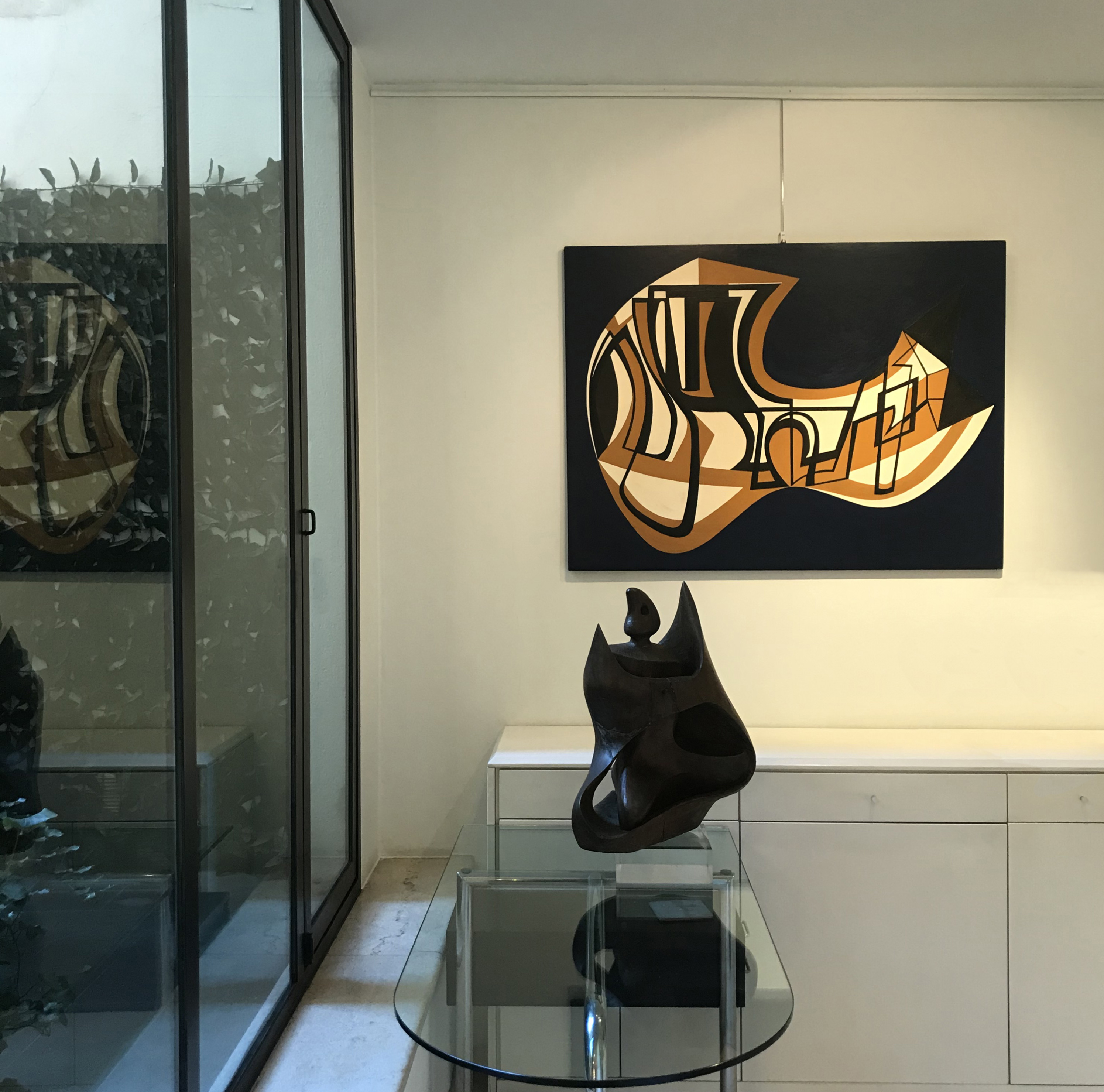 Objecto encontrado in el desierto, 1955 ca. (smalto su masonite, cm. 97x130) presente in mostra è un raro esempio del periodo geometrico dell’artista che ha inizio a Lima nel 1952 per concludersi in Italia nel 1959, periodo nel quale l’artista rifiuta la pittura figurativa e paesaggistica.