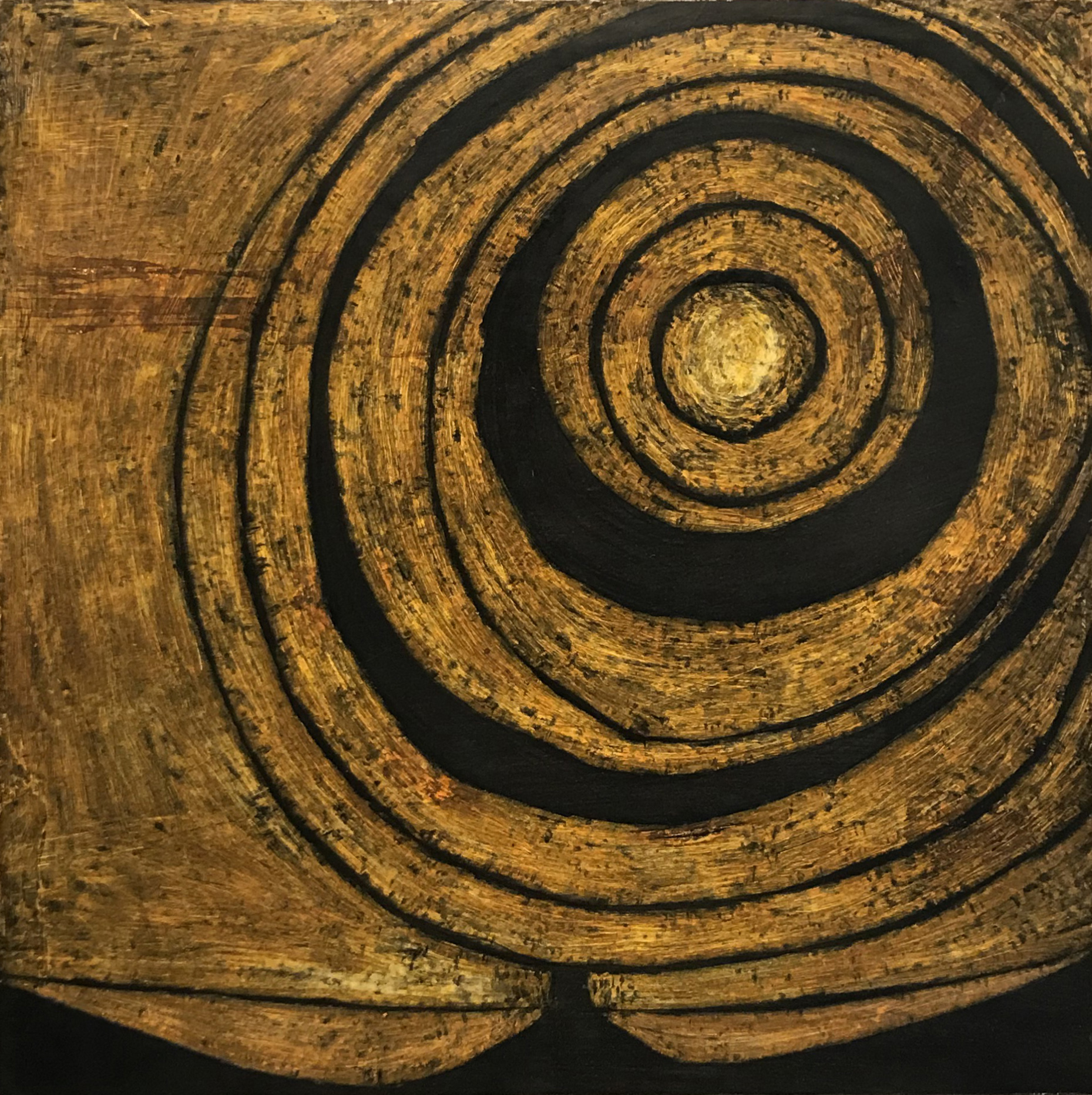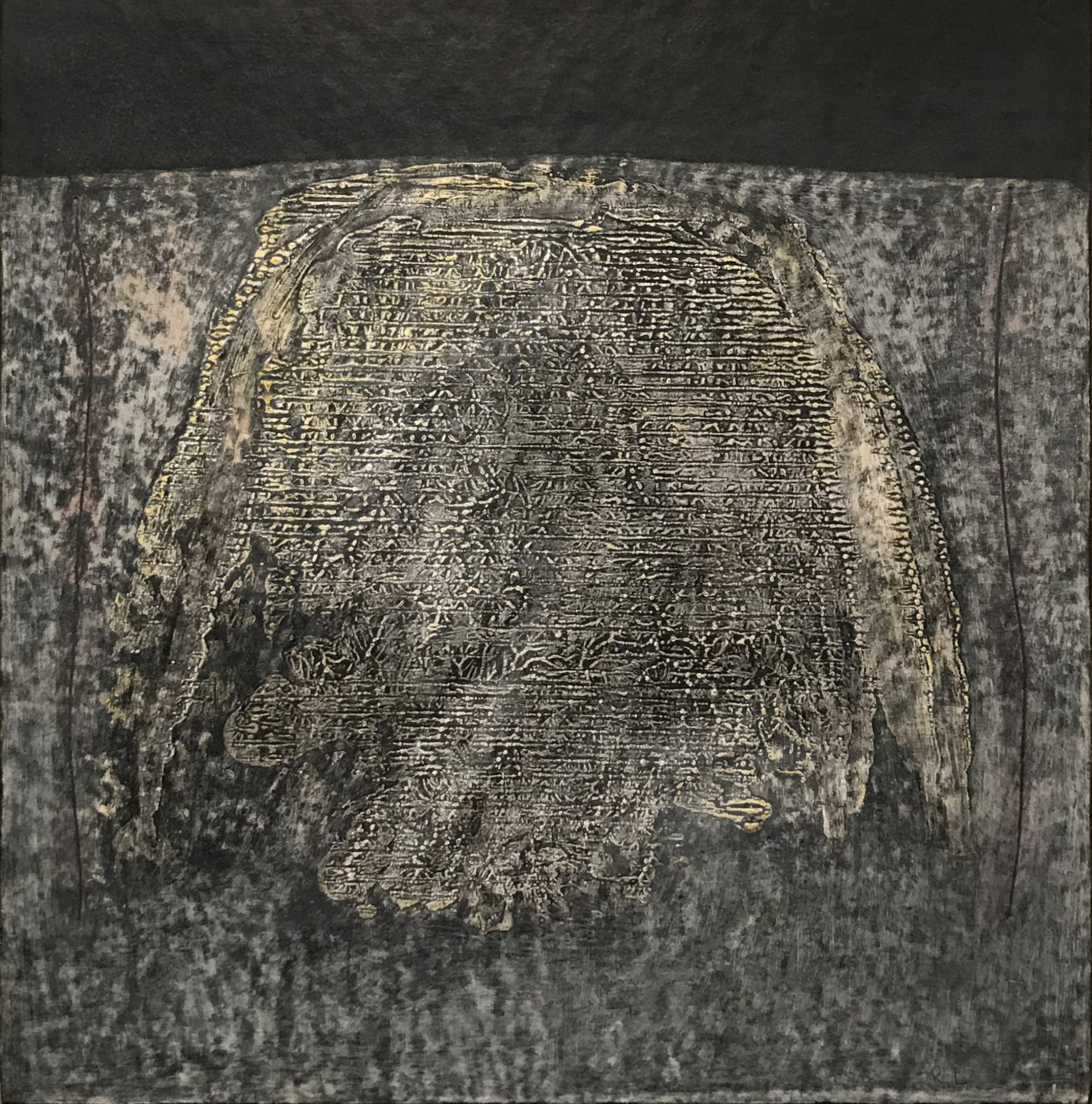 In questo dipinto è evidente la geometria originaria della simbologia e dell’architettura delle diverse culture Inca e precolombiane, esperienza che accomuna gli artisti presenti in questa esposizione.