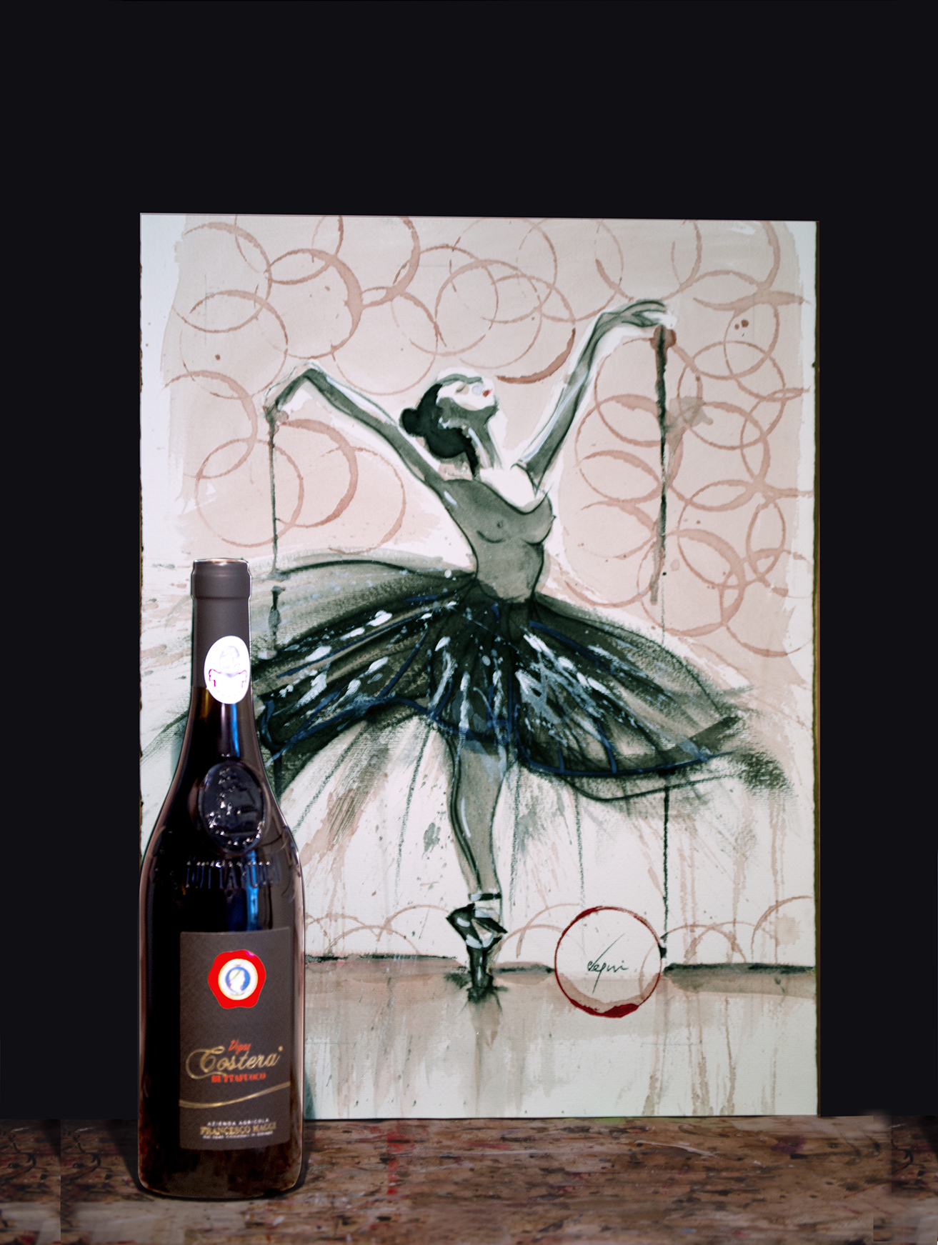 La Tecnica: Degni conferma la sua "poetica alcolica", dipingendo con i migliori rossi italiani per dare vita a opere che spaziano dai ritratti iconici agli scorci della Milano storica, come la Torre Velasca e il Duomo.