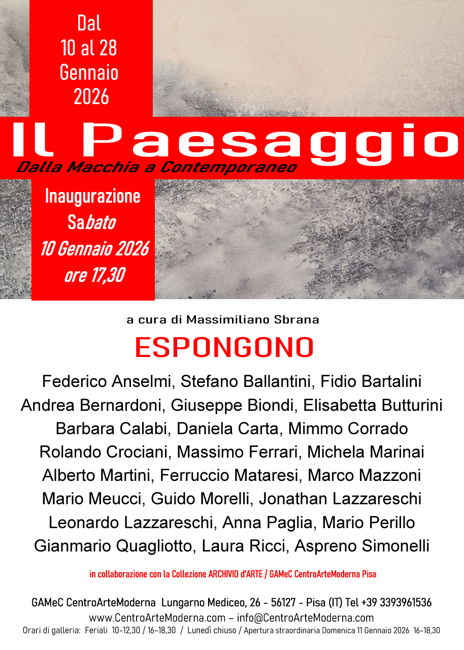 Si inaugurerà Sabato 10 Gennaio 2026 alle ore 17,30 (visitabile fino al 28 Gennaio 2026 con ingresso libero) ordinata e curata da Massimiliano Sbrana, presso il GAMeC CentroArteModerna di Pisa (Lungarno Mediceo,26) la mostra "Dalla Macchia al Contemporaneo" dedicata al tema del "Il Paesaggio" .