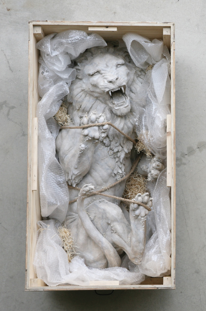 Daniele Accossato presenta opere in cui la scultura vive di perenne spaesamento: incastrata in casse da spedizione (che fanno parte dell’opera stessa) oppure velata e coperta da fasciature e imballaggi (che sono integrate nella materia stessa della scultura) ineliminabili questa non riesce a lasciare vivere appieno una bellezza che, non liberata e mostrata, rimane sempre potenziale.