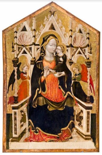 Iniziamo la presentazione della mostra da alcuni importanti capolavori che saranno esposti a Fermo: il Polittico di Sant’Eutizio di Nicola di Ulisse da Siena, che arriva da Spoleto ed è appena restaurato dopo il terremoto del 2016, il Cristo Risorto sempre di Nicola di Ulisse, opera visibile solo in mostra poiché il Museo di Castellina da cui proviene è oggi impraticabile, la Madonna in Umiltà con santa Caterina, Crocifissione, un dipinto di grande pregio di Andrea Delitio, il Polittico di Massa Fermana di Carlo Crivelli, che è la prima opera marchigiana dell’artista veneziano a cui la mostra dedica una notevole sezione insieme ad alcune opere del fratello Vittore Crivelli. Fra gli oggetti di arte quattrocentesca esposti, come oreficerie o tessuti è poi un gruppo di opere ceramiche: boccali e piatti dell’Officina ‘Sforzesca’ di Pesaro della seconda metà del Quattrocento fra cui un preziosissimo Boccale con volto di donna a rilievo, un Boccale con decoro alla foglia gotica detta ‘cartoccio’, ed un terzo Boccale con stemma dipinto.