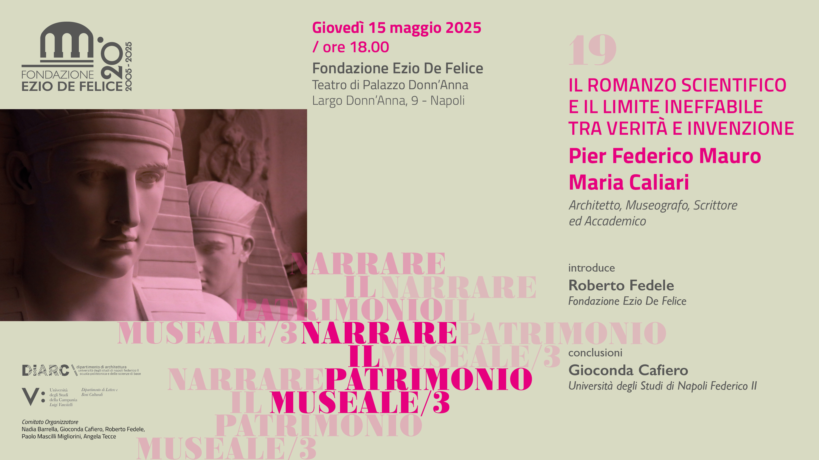 La narrazione come metodo, il romanzo come strumento di indagine. Giovedì 15 maggio 2025, alle ore 18, presso il Teatro di Palazzo Donn’Anna (Largo Donn’Anna, 9 – Napoli), la Fondazione Ezio De Felice accoglie Pier Federico Mauro Maria Caliari, architetto, museografo, scrittore e accademico, per il 19° incontro della rassegna “Narrare il Patrimonio Museale”.