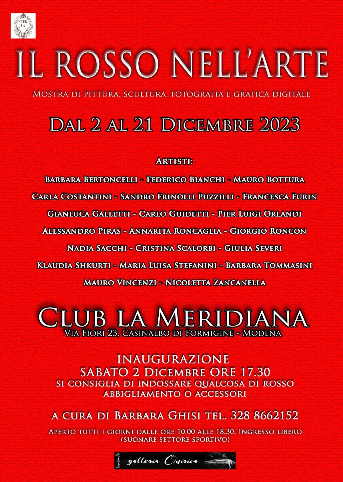 E’ all’insegna del rosso la mostra che inaugura sabato 2 dicembre dalle ore 17.30 nelle sale della villa settecentesca del club la Meridiana a Casinalbo di Formigine. Venti artisti tra pittori, scultori e fotografi si confronteranno esponendo opere che faranno emergere questo colore. Per rimanere a tema, anche chi desidera presenziare all’inaugurazione è pregato di indossare o portare in vista, qualcosa di rosso.