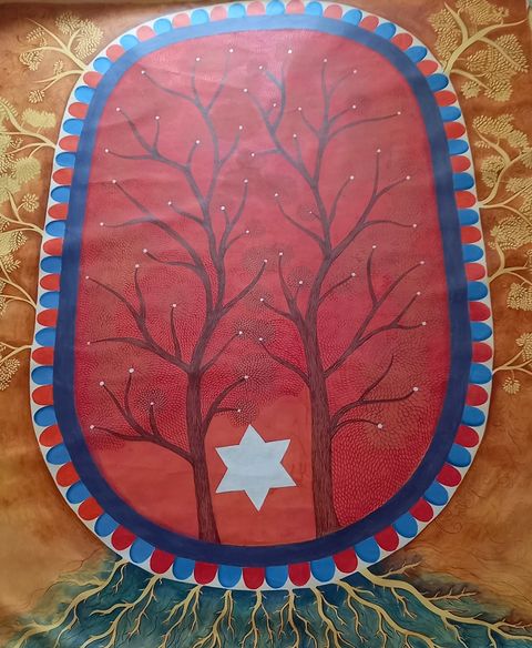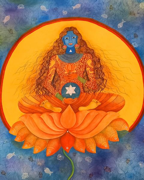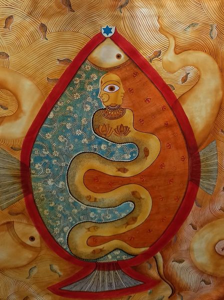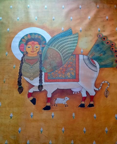 4 opere, 2x2m, raffiguranti Kamdhenu, la vacca desiderosa, Kalpavriksha, nella mitologia indù l’albero è un simbolo di vita e fertilità, Vishnu si è incarnato in ub pesce per salvare il mondo dall’inondazione di Lord Shiva, Shakti, l’epitoma femminile della forza,