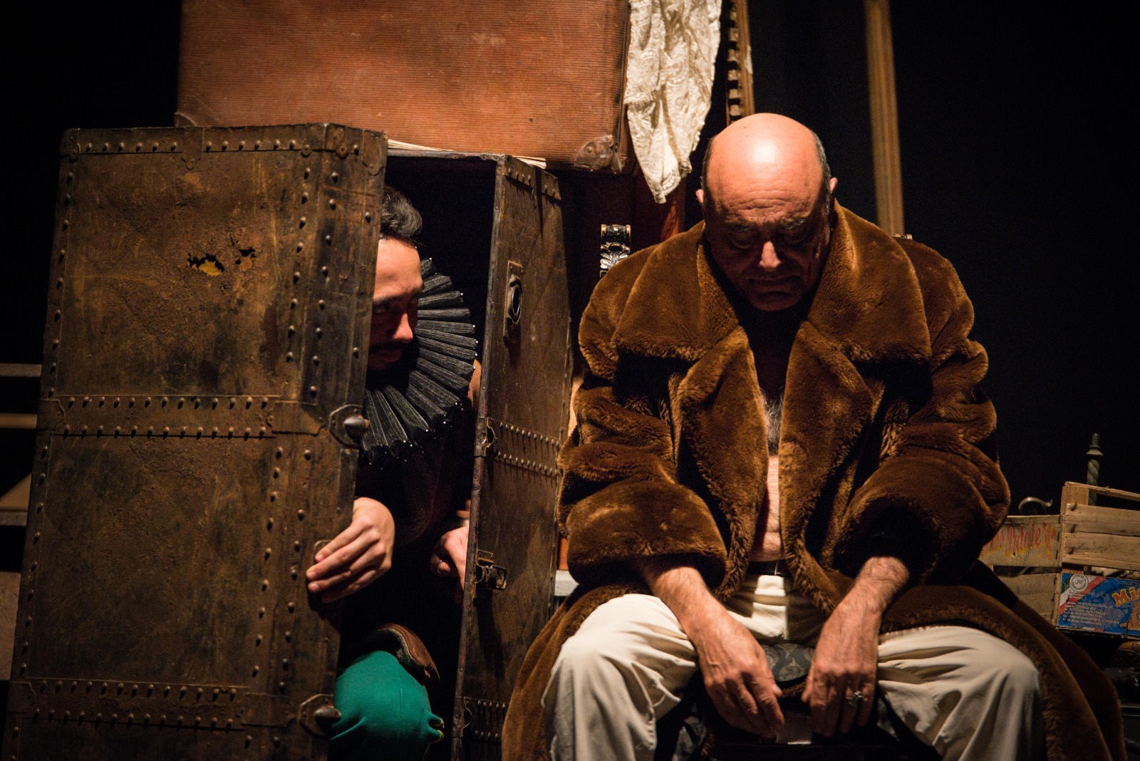 In scena troviamo un Re e il suo fedele Buffone, il Servo, latitanti e segregati nel sottosuolo, due balordi nascosti in un sotterraneo, “il mondo di sotto”, che giocano a rifuggire e al tempo stesso a dominare “il mondo di sopra” che in verità è sotto il loro controllo.