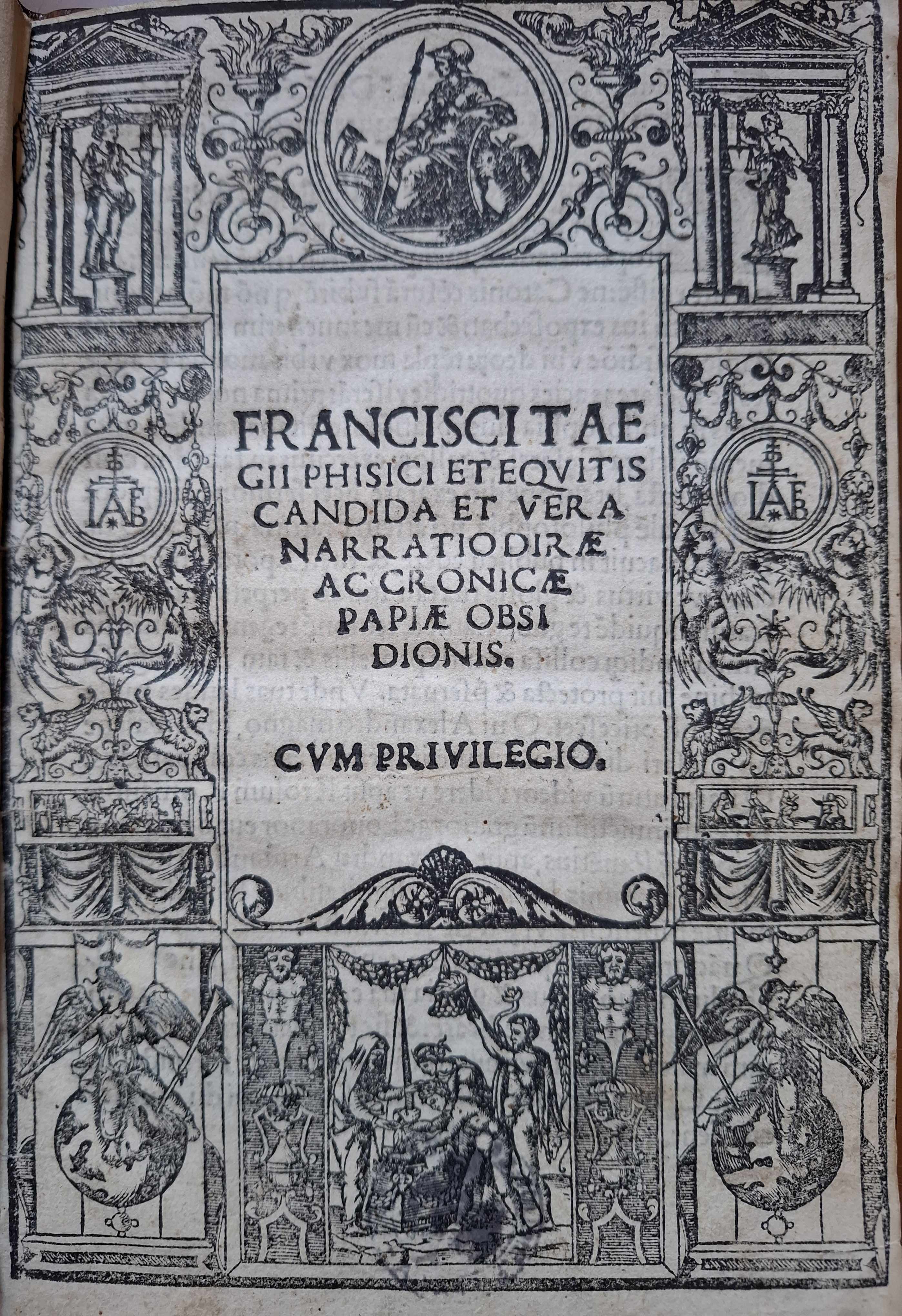L’epidemia di peste, l’assedio francese del 1522 e quello, più duro e lungo, iniziato nell’ottobre 1524 e terminato il 24 febbraio 1525 con la Battaglia, impongono un graduale fermo dell’attività tipografica. In quell’anno, l’unica opera stampata a Pavia è la Narratio di Francesco Taegio, fulcro della mostra, che racconta i drammatici eventi di quei giorni. La sua diffusione è significativa: già nel 1525 viene pubblicata in Germania, Svizzera e Cremona; nel 1655 è ristampata due volte a Pavia e nel 1736 compare a Norimberga.