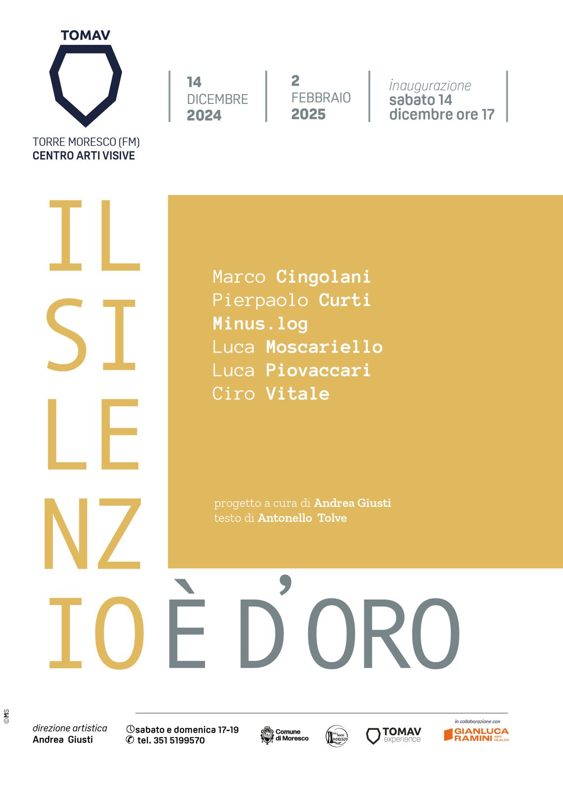 Tomav_Torre Moresco Centro Arti Visive presenta il progetto dal titolo IL SILENZIO È D'ORO con protagonisti i seguenti autori: Marco Cingolani, Pierpaolo Curti, Minus.log, Luca Moscariello, Luca Piovaccari, Ciro Vitale.