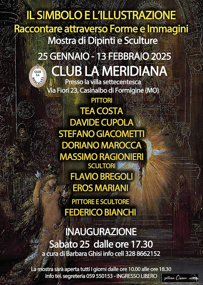 La grande mostra d’arte dal titolo “Il simbolo e l’illustrazione, raccontare attraverso forme e immagini” inaugura ad ingresso libero sabato 25 Gennaio dalle ore 17.30 nella villa settecentesca del Club La Meridiana a Casinalbo di Formigine, Modena. La curatrice Barbara Ghisi presenterà al pubblico 8 artisti che con opere di scultura, pittura e illustrazione stimoleranno la fantasia dell’osservatore raccontando storie di vita al fine di provocare reazioni e creare emozioni. Di residenza a Formigine nel modenese vi sono l’architetto e pittrice Tea Costa originaria di Napoli che espone dipinti di forte impatto sociale, e l’acquerellista e scrittore Stefano Giacometti nato a Palmanova (UD) con illustrazioni ironiche che raccontano storie. Tra gli altri artisti emiliani il pittore e grafico Davide Cupola di Lugagnano Val d’Arda in provincia di Piacenza che unisce il minimalismo al simbolo per creare opere cariche di significato. Il pittore Massimo Ragionieri di Praticello di Reggio Emilia che espone una lunga serie di opere significative attraverso il surreale. Doriano Marocca pittore residente a Reggio Emilia espone due suoi dipinti di simbologia astratta e lo scultore Eros Mariani di Osteria Grande (BO), porta sculture in metallo raffiguranti eleganti figure femminili dalle movenze dinamiche. Giungono invece dalla Lombardia Federico Bianchi pittore e scultore professionista di Cremona e Flavio Bregoli scultore fonditore di originalissime opere in bronzo e alluminio, residente a Borgo Virgilio di Mantova. La mostra resterà in visione al pubblico tutti i giorni dalle ore 10.30 alle ore 18.30 fino al 13 Febbraio. Il sabato pomeriggio e la domenica tutto il giorno con visita guidata della curatrice. Info tel. 328 8662152.