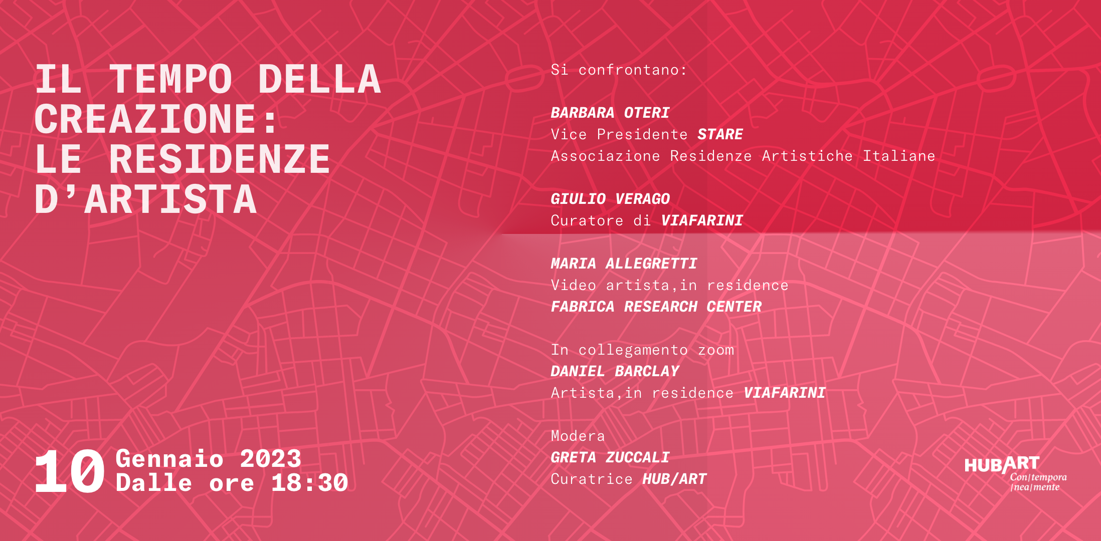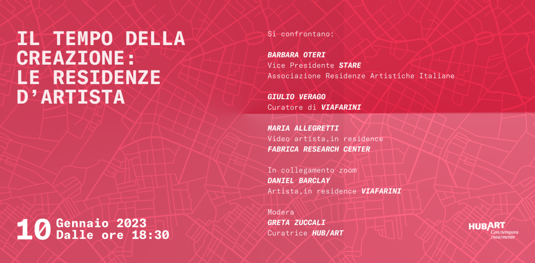 Martedì 10 gennaio 2023 si terrà presso Hub/Art Milano il talk “Il tempo della creazione: le residenze d’artista”, in occasione del finissage delle mostre “Immagine. Tempo” e “Lìneas de Palabras”.