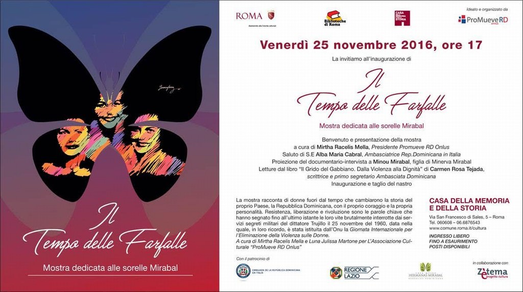 Attraverso biografie, foto, poesie, arte e testimonianze, la mostra racconta di donne fuori dal tempo che cambiarono la storia del proprio Paese, la Repubblica Dominicana, con il proprio coraggio e la propria personalità. Diventata simbolo della lotta contro la violenza sulle donne, la storia delle sorelle Mirabal, “Le Farfalle”, è racconto di resistenza, liberazione e rivoluzione, parole chiave che hanno segnato fino all’ultimo istante le loro vite brutalmente interrotte dai servizi segreti militari del Dittatore Trujillo il 25 novembre del 1960, data nella quale, in loro ricordo,è stata istituita dall’Onu la Giornata Internazionale per l’Eliminazione della Violenza sulle Donne.