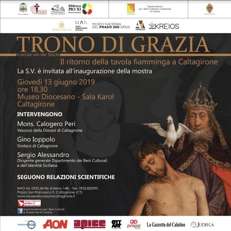 La mostra ruota intorno al Trono di Grazia, un pregevolissimo dipinto fiammingo attribuito a Vrancke van der Stockt (Bruxelles ante 1420 – 1495), forse allievo del più noto Roger van der Weyden, risalente alla fine del XV secolo (1485 – 1495 ca.). Il dipinto, opera unica nel panorama della pittura siciliana, giunse in Sicilia probabilmente poco dopo la sua realizzazione, forse acquistato da qualche avo del nobile casato della baronessa Agata Interlandi della Favarotta che nel 1783 lo donò alla chiesa di San Giorgio di Caltagirone.
