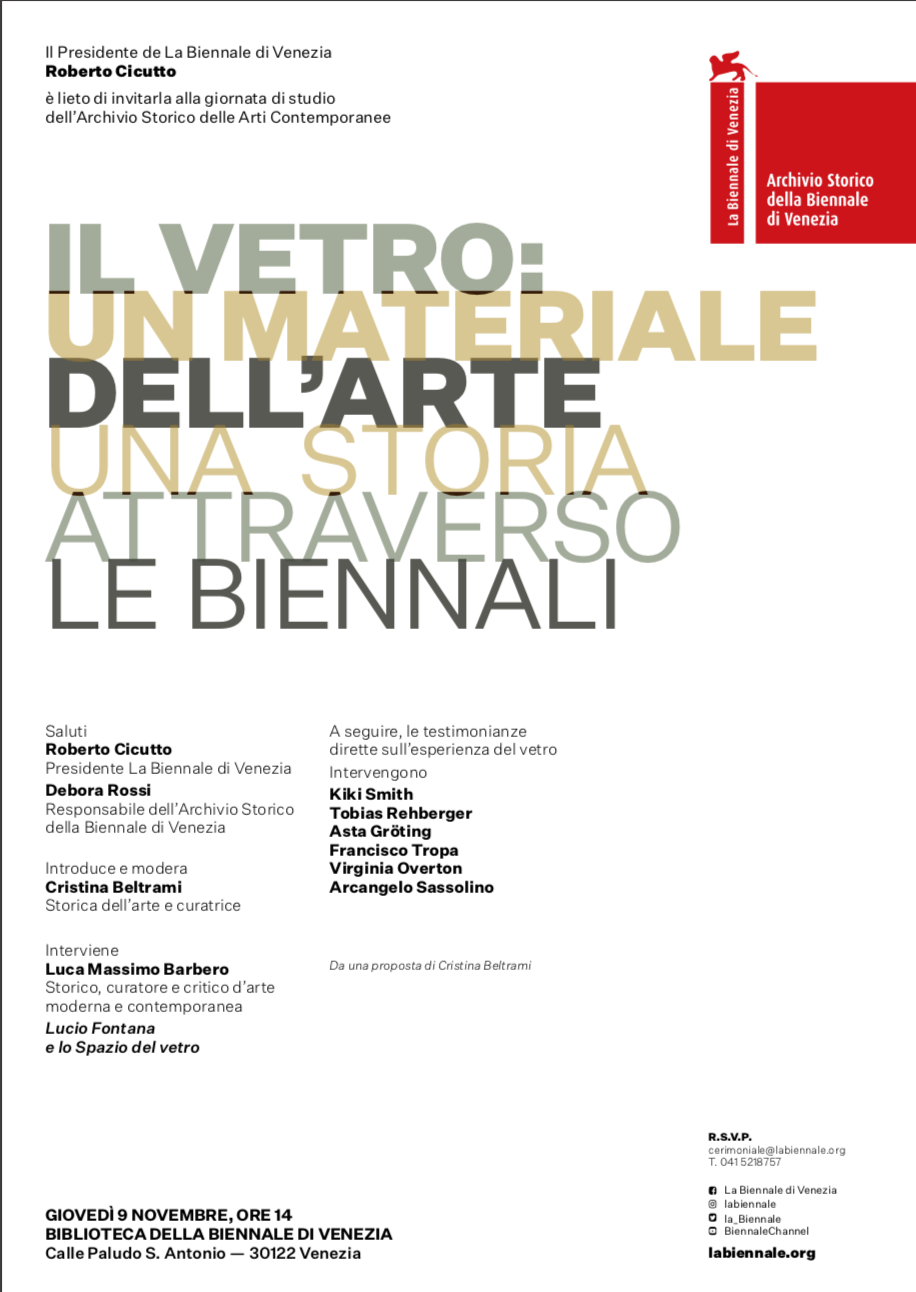 Il panel affronterà la complessa tematica del vetro come materiale dell’arte attraverso la testimonianza diretta di 6 artisti internazionali transitati negli anni negli spazi della Biennale di Venezia ai quali si aggiunge un intervento di Luca Massimo Barbero su Lucio Fontana e lo Spazio del vetro.