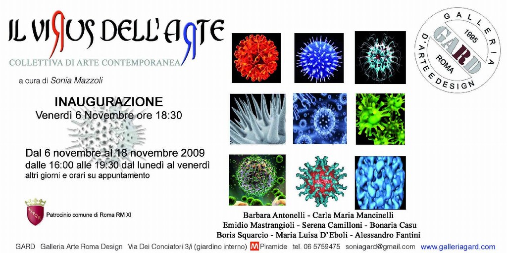 Inaugura il 6 novembre, presso la Galleria “GARD”, l’esposizione di arte contemporanea “Il Virus dell’Arte”. In mostra opere di arte visiva realizzate da artisti, differenti per stile, tecnica e ricerca artistica, ma accomunati dallo stesso comune denominatore: il virus dilagante dell'arte che attacca le menti , e stimola la creatività, trasmettendo al fruitore, proprio come un virus, sensazioni ed emozioni sia al cervello che al corpo, attraverso la visione delle opere.