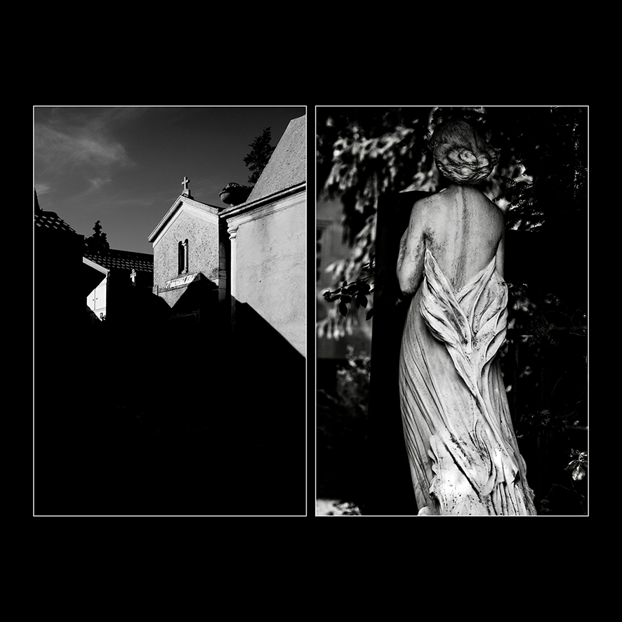 Nel 2015 avevo scattato le mie foto nel Cimitero di Pizzoli, concentrandomi sulle ombre e le geometrie nette delle cappelle funerarie. Riguardandole mi sono accorta che c'era altro oltre l'immagine e mi chiedevo se fosse possibile rappresentare lo spessore di quel silenzio, fatto di anime, ricordi, affetti e rimpianti. Così, riflettendo su questo, mi sono imbattuta negli scatti di Ida Marinella Rigo nel Cimitero Monumentale di Milano. Ci siamo contattate ed è nato così questo progetto a quattro mani.