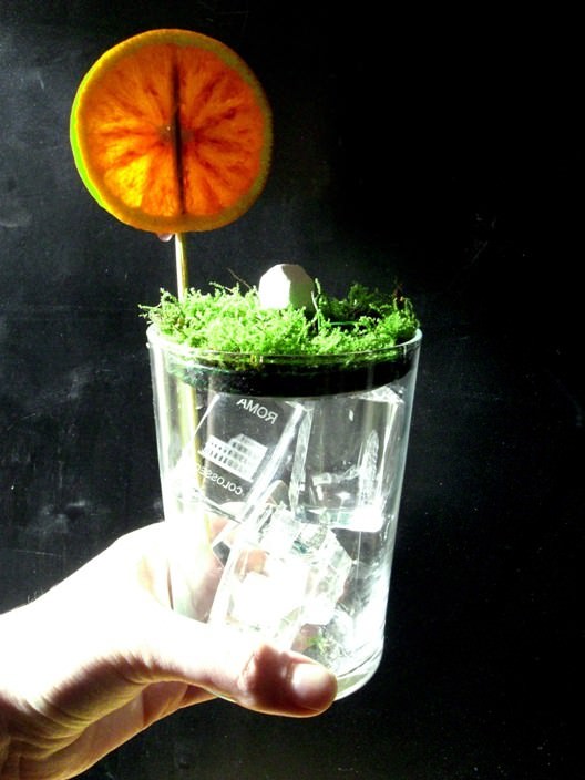 Roma, città natale dell’artista, è diventata la scenografia perfetta per un tema così complesso quale la sostenibilità, il recupero del patrimonio architettonico e l’inserimento nel paesaggio. La composizione dell’immagine nasce da una sorta di mini istallazione che condensa e rappresenta una serie di pensieri, emozioni e riflessioni. Un bicchiere da cocktail contiene al suo interno cubetti di ghiaccio-souvenir con i simboli di Roma, il Colosseo, il Vaticano, ma anche elementi architettonici e naturali. La cannuccia rossa o la fetta d’arancia dona alla piccola architettura il colore, ma anche la leggerezza e la spensieratezza che ogni visitatore riporta dalle vacanze romane.