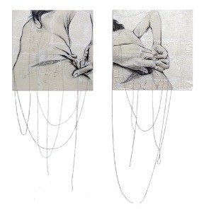 Una mano salda. Un ago ostinato, deciso. Un filo che pende giù dalle tele. E le