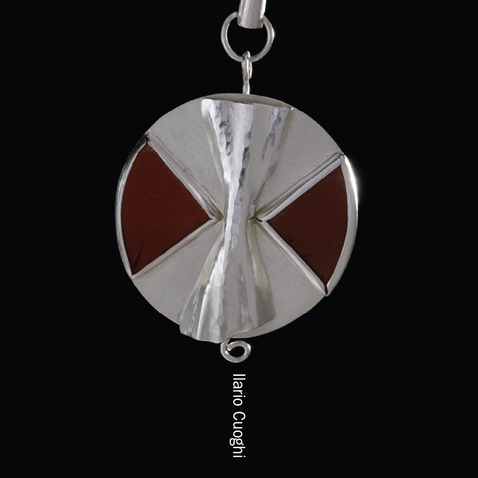 Scultore prima di tutto, Ilario Cuoghi riesce a dispiegare la medesima potenza nelle grandi opere pubbliche così come nelle piccole sculture e nei monili. Tutti i suoi lavori, sotto qualsiasi denominazione li si voglia classificare, sono accomunati da una serie di caratteristiche ricorrenti. Innanzitutto la ricerca sulle forme, che lo porta a prediligere impostazioni lineari, geometrie nette, sezioni di cerchio. Poi un gusto per le asimmetrie che lui riesce puntualmente a tradurre in equilibri, un’abilità che ha il potere di trasformare le sue creazioni in trappole per lo sguardo, ipnotiche come rompicapo dai quali non sia possibile separarsi finché non se ne è trovata la chiave. Anche i materiali ricorrono, dominati dall’argento. Ilario Cuoghi lo tortura, lavorandolo con il martello fino ad ottenere superfici scabre, sfaccettate, sulle quali la luce entra in vibrazione; texture percorse da centinaia di impronte: le tracce del suo meticoloso procedere. Infine il colore, che affida alla pietra. Ambra, lapislazzulo, ametista, agata verde, onice nera, malachite, diaspro sanguigno e l’amata corniola campeggiano come cuori pulsanti al centro della composizione, nel punto dal quale partono tutte le linee di forza. Mai incastonate, perché l’artista sente il castone come una prigione. Piuttosto posate in un nido che le custodisca senza costringerle, regalando loro anche una certa libertà di movimento. Un po’ come accade per i collegamenti tra le differenti parti del gioiello, sempre mobili e dinamici, perché ottenuti con chiodi e ganci e mai attraverso saldature.