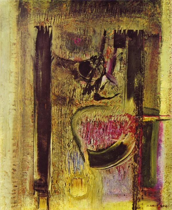 E' allora che Ilario Rossi sviluppa una duplice vena poetica, -tesa fra un ordito formale di forte complessione e il segreto arabescato del suo -altro da se'' informale-, secondo le parole del critico; e si tratta d'una -seduzione' pervasa di profumi quasi piu' francesi che italiani, piu' tachiste che informel, piu' orientata verso De Stael e cioe' formale, che votata agli esiti estremi della art autre predicati da Tapie'.