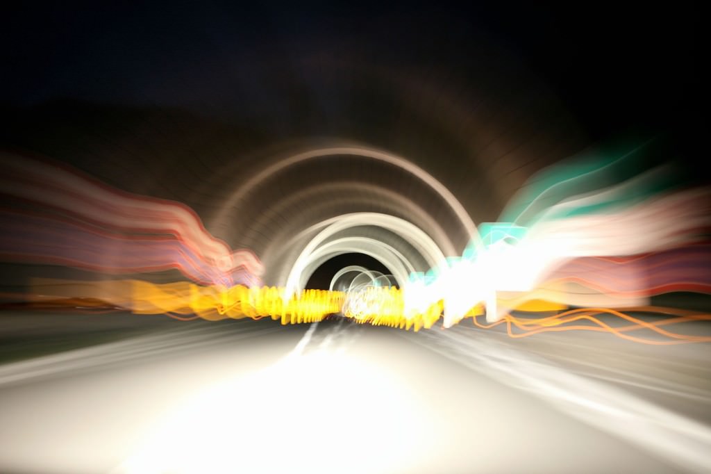 Una interpretazione notturna dei tunnel delle autostrade fotografati da una macchina in piena velocità con riferimento alle molteplici simbologie delle gallerie