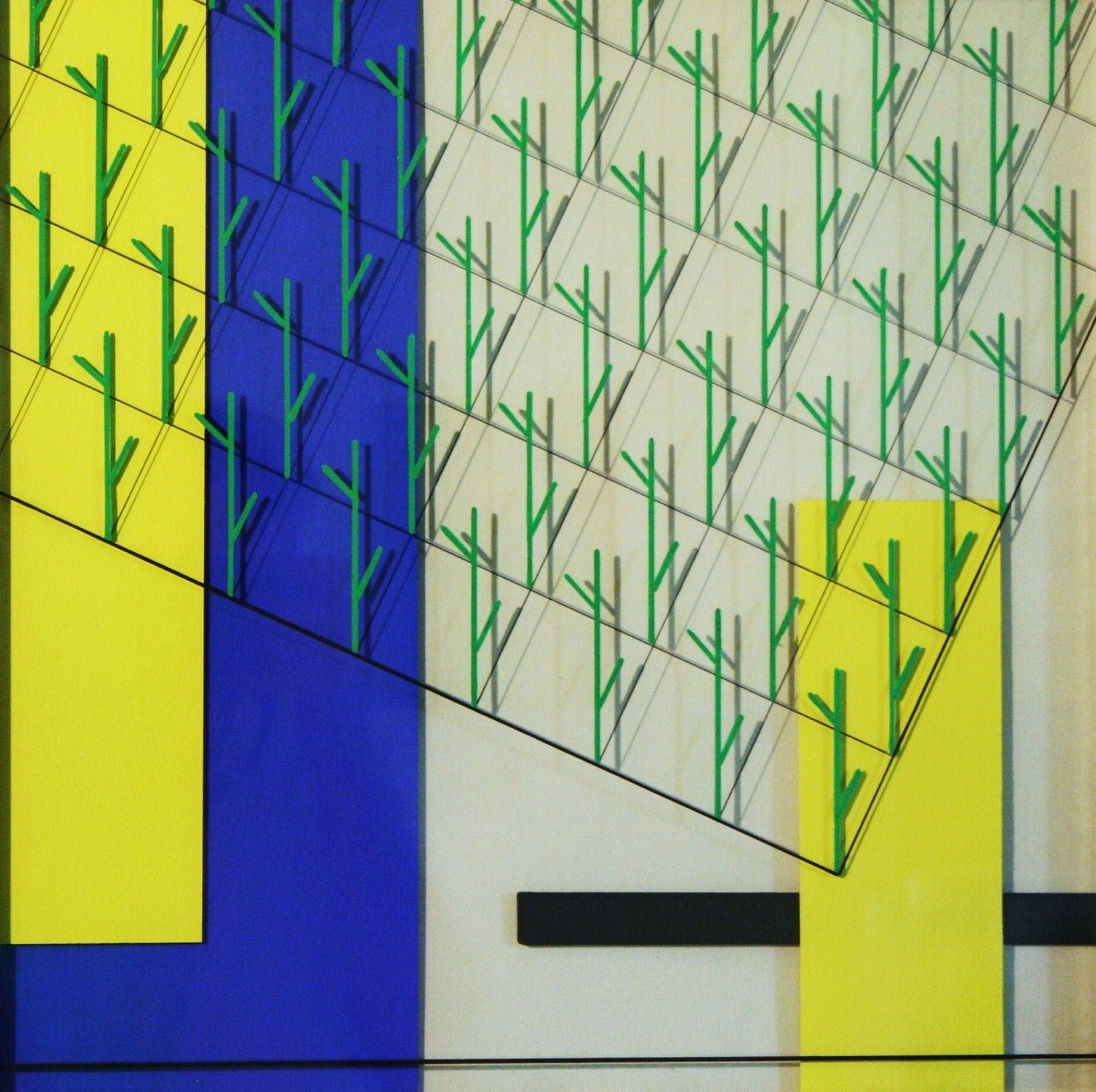 Iler Melioli (Reggio Emilia, 1949) rappresenta uno dei “ritorni” alla materia e alla castità delle forme chiamato Neo Geo. In reazione all’accentuato soggettivismo del neo-espressionismo, all’inizio degli anni ottanta risorge negli Stati Uniti e in Europa una nuova astrazione geometrica definita sin dalla metà del decennio Neo Geo (abbreviazione di neo geometric conceptualism), che comprende l’utilizzo di oggetti propri dell’immaginario quotidiano della cultura moderna, presentati tout court come opere d’arte di una bellezza senza tempo, o raffigurazioni geometriche giocate sull’accostamento di tonalità cromatiche o di effetti “optical” che donano alla superficie pittorica l’illusione di forme in rilievo, o la combinazione di tecniche, materiali e oggetti provenienti dalla contemporanea civiltà tecnologica e dai mezzi di comunicazione di massa. Con la pubblicazione AnniNovanta (ed.Mondadori), Renato Barilli storicizza la ricerca di Melioli nel quadro del neominimalismo accanto al gruppo della East Coast americana formato da Jeff Koons, Haim Steinbach e Peter Halley, oltre ad altri autorevoli esponenti europei quali Jonn Armleder, Günter Förg, Stefano Arienti e Sergio Fermariello.