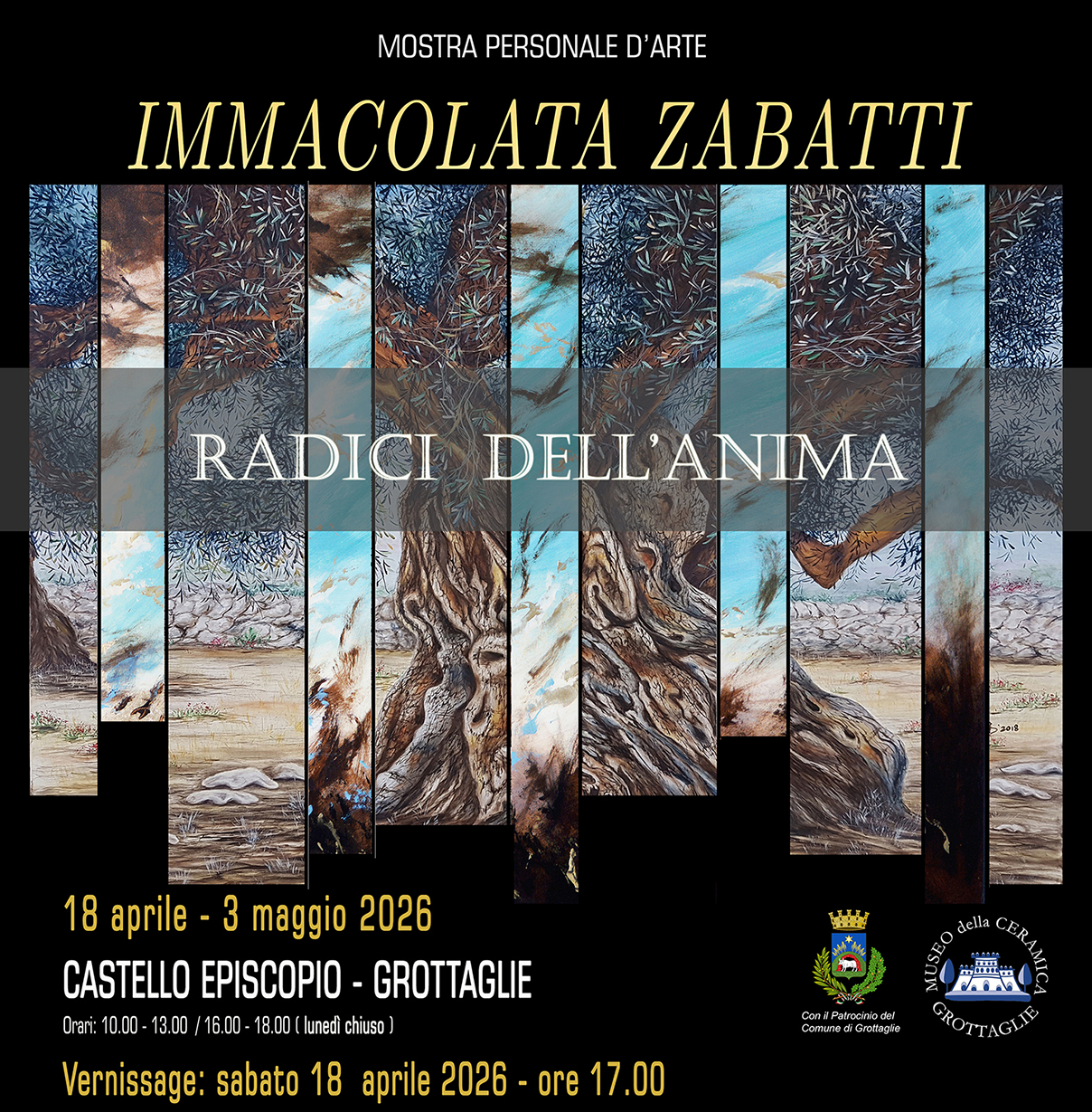 Radici Dell’ Anima è il titolo della mostra personale dell’artista Immacolata Zabatti che sarà inaugurata nella Sala del Castello Episcopio di Grottaglie (TA) sabato 18 aprile, alle ore 17. L’esposizione sarà allestita nella sala del Castello Episcopio dal 18 aprile al 3 maggio, visitabile negli orari: 10.00 – 13.00 / 16.00 – 18.00 chiuso il lunedì.