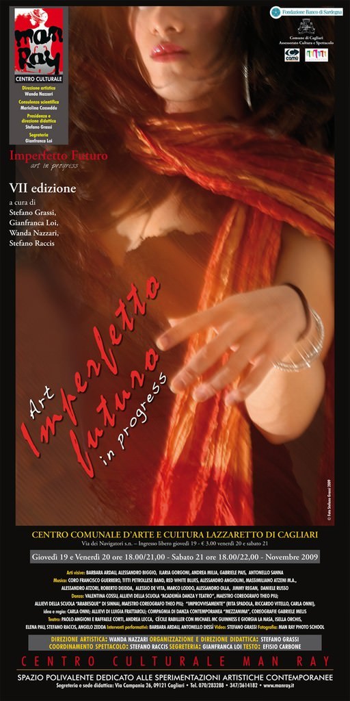 “Imperfetto Futuro” è un progetto interattivo di Wanda Nazzari, direttore artistico del Centro Culturale Man Ray di Cagliari, Spazio Polivalente Dedicato alle Sperimentazioni Artistiche Contemporanee. L’evento, alla sua settima edizione, avrà luogo negli spazi del Centro Comunale d’Arte e Cultura “Il Lazzaretto” di Cagliari, i giorni giovedì 19 e venerdì 20 novembre dalle 18 alle 21.00 e sabato 21 dalle 18.00 alle 22.00.