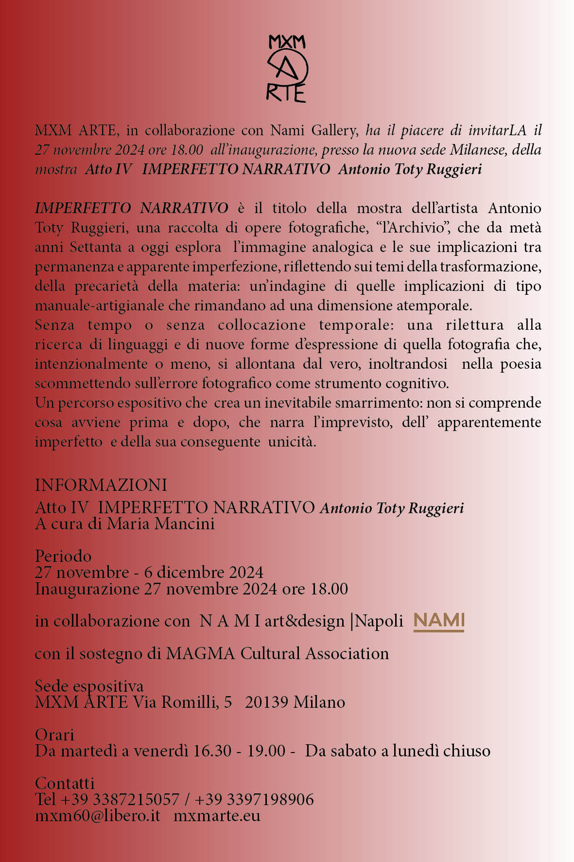 IMPERFETTO NARRATIVO è il titolo della mostra , una raccolta di opere fotografiche, "l’Archivio", che da metà anni Settanta a oggi esplora l’immagine analogica e le sue implicazioni tra permanenza e apparente imperfezione, riflettendo sui temi della trasformazione, della precarietà della materia: un’indagine di quelle implicazioni di tipo manuale-artigianale che rimandano ad una dimensione atemporale.