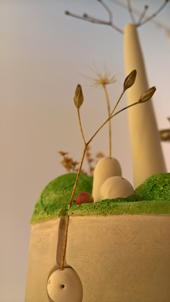 In questi giardini sui generis la forza vitale di bulbi e semi, la incredibile colonizzazione di concrezioni su un telaio d'auto dismessa sembrano contrastare la classicità delle teste arcaiche di Core e Demetra, l'antica tecnica del kintsugi, la ceramica primitiva. Diverse manifestazioni della forza inarrestabile e incontenibile, ma pur sempre fragile, dell'arte e della natura.