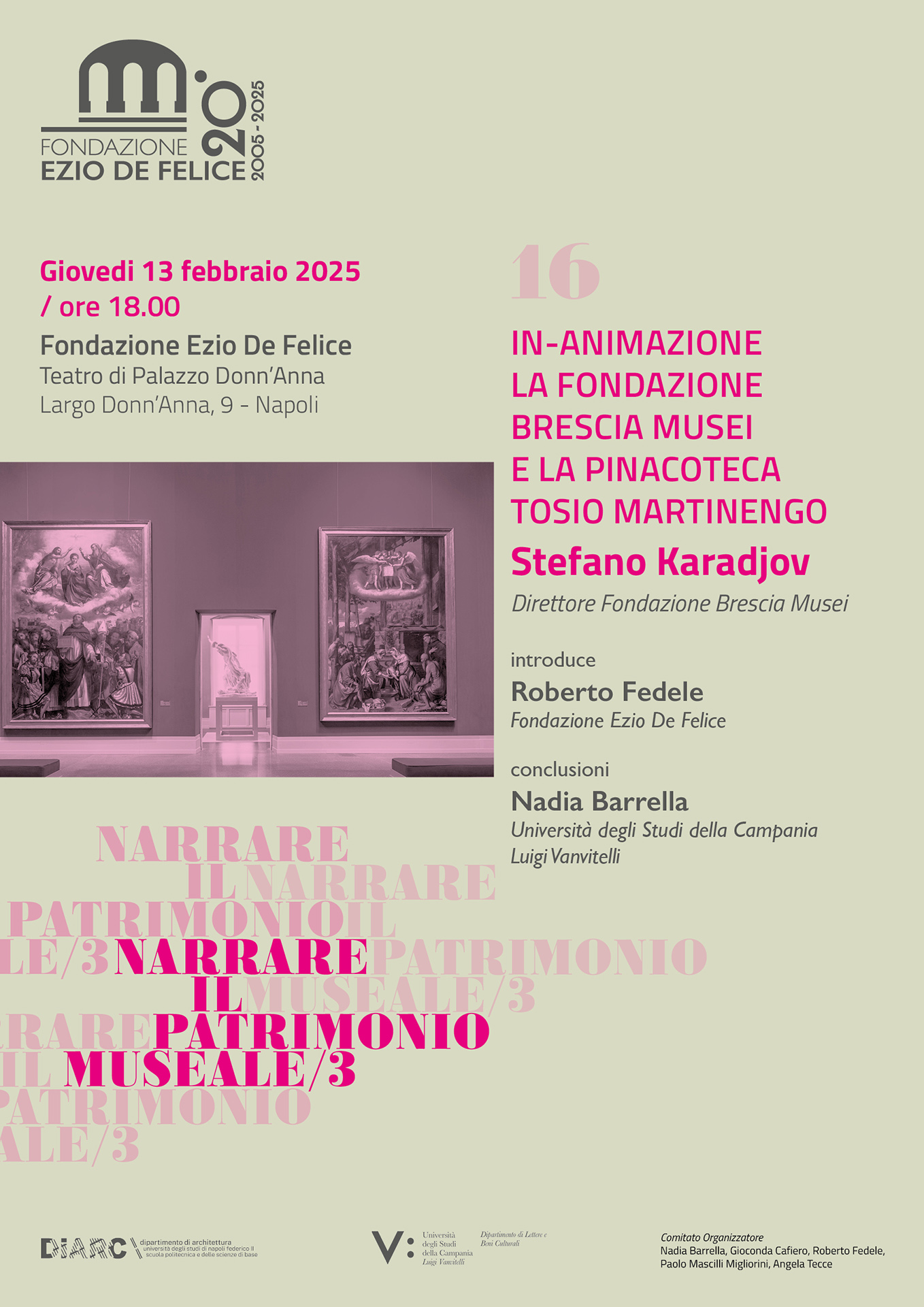 L’incontro con il direttore Stefano Karadjov è il 16° dell’intera rassegna Narrare il Patrimonio museale che nasce nel 2022 per iniziativa della Fondazione Culturale De Felice in collaborazione con il Dipartimento di Lettere e Beni Culturali della Università degli Studi della Campania Luigi Vanvitelli e il Dipartimento di Architettura della Università degli Studi di Napoli Federico II.