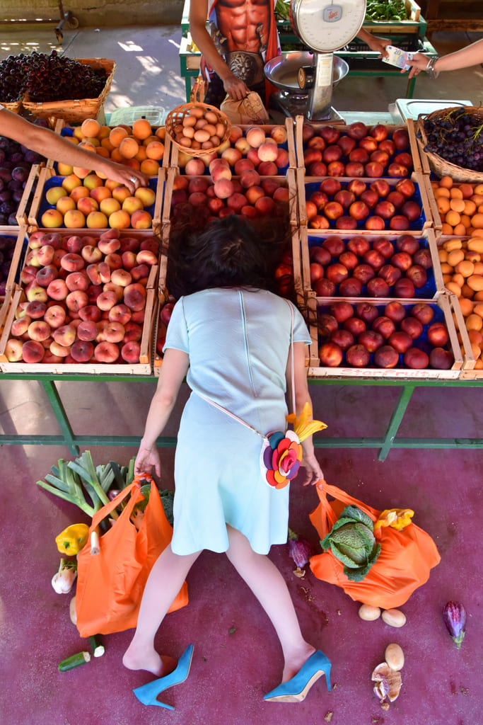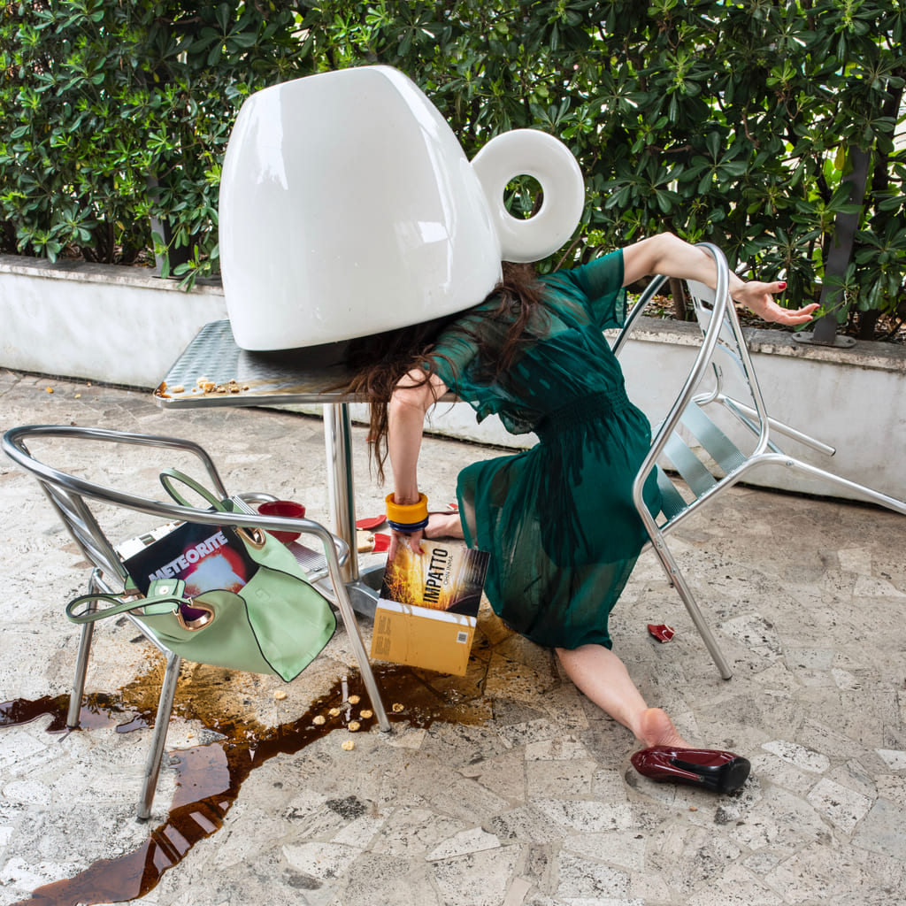 Nasce da lì l’idea e subito la prima fotografia, Homme sur le velo, ispirata anch’essa a un incidente reale e realizzata con un Iphone. La fotografia diventa virale, un rimpallo sorprendente su Instagram che porta nel giro di pochissimo tempo a un numero crescente e progressivo di followers sui social che diventano ben presto centinaia di migliaia. Remmidemmi da allora realizza decine e decine di fotografie i cui i protagonisti sono sempre persone “schiantate” rovinosamente a terra, circondate da coloratissimi oggetti che appartengono alla sfera del loro personale quotidiano (molto spesso causa di quella caduta). I colori sgargianti degli abiti, le simmetrie impeccabili di corpi e oggetti riprodotte nella scena danno vita a immagini curatissime nei dettagli intorno ai quali l’occhio si perde curioso.