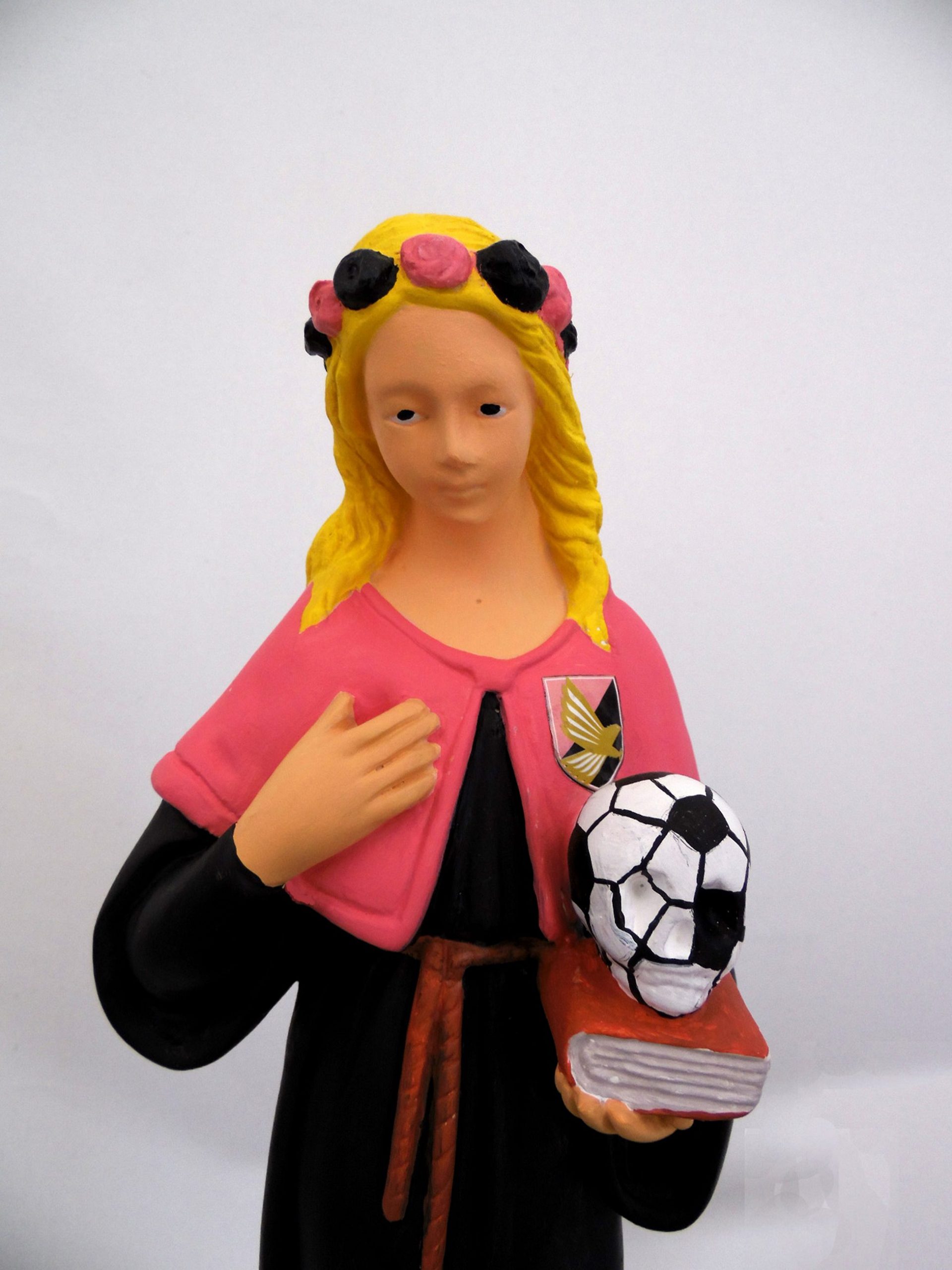 Da questi riti di espiazione/devozione nasce l’ultimo lavoro del Laboratorio Saccardi che, quasi a replicare la pratica degli ex voto, ha realizzato dalla fusione di 3000 monete di centesimi di euro la statua della Madonna collocata presso la Chiesa dei Quaranta Martiri di Palermo. Si tratta di una meditazione profonda e dissacratoria, colta e audace, su quel senso del sacro e del suo opposto che caratterizza la Sicilia, della quale gli artisti del Saccardi colgono gli aspetti più sinceri e contraddittori. Una riflessione che anima provocatoriamente le xilografie – realizzate in occasione della bi-personale Saccardi-Cucchi, inaugurata lo scorso novembre alla Galleria d’Arte Moderna di Palermo – raffiguranti la mitica setta dei Beati Paoli al cui mito popolare, nonostante riletture e revisionismi storici, è associata la nascita della mafia in Sicilia. Lo stesso accade nella piccola effige di Santa Rosalia, amata patrona della città, apparentemente tradizionale nell’impostazione iconografica, e tuttavia ‘dissacrata’ da quel teschio che diventa un pallone e dallo stemma del calcio Palermo sul suo mantello, in un continuo slittamento semantico tra simbologia sacra e profana, vecchi desideri e nuovi miti.