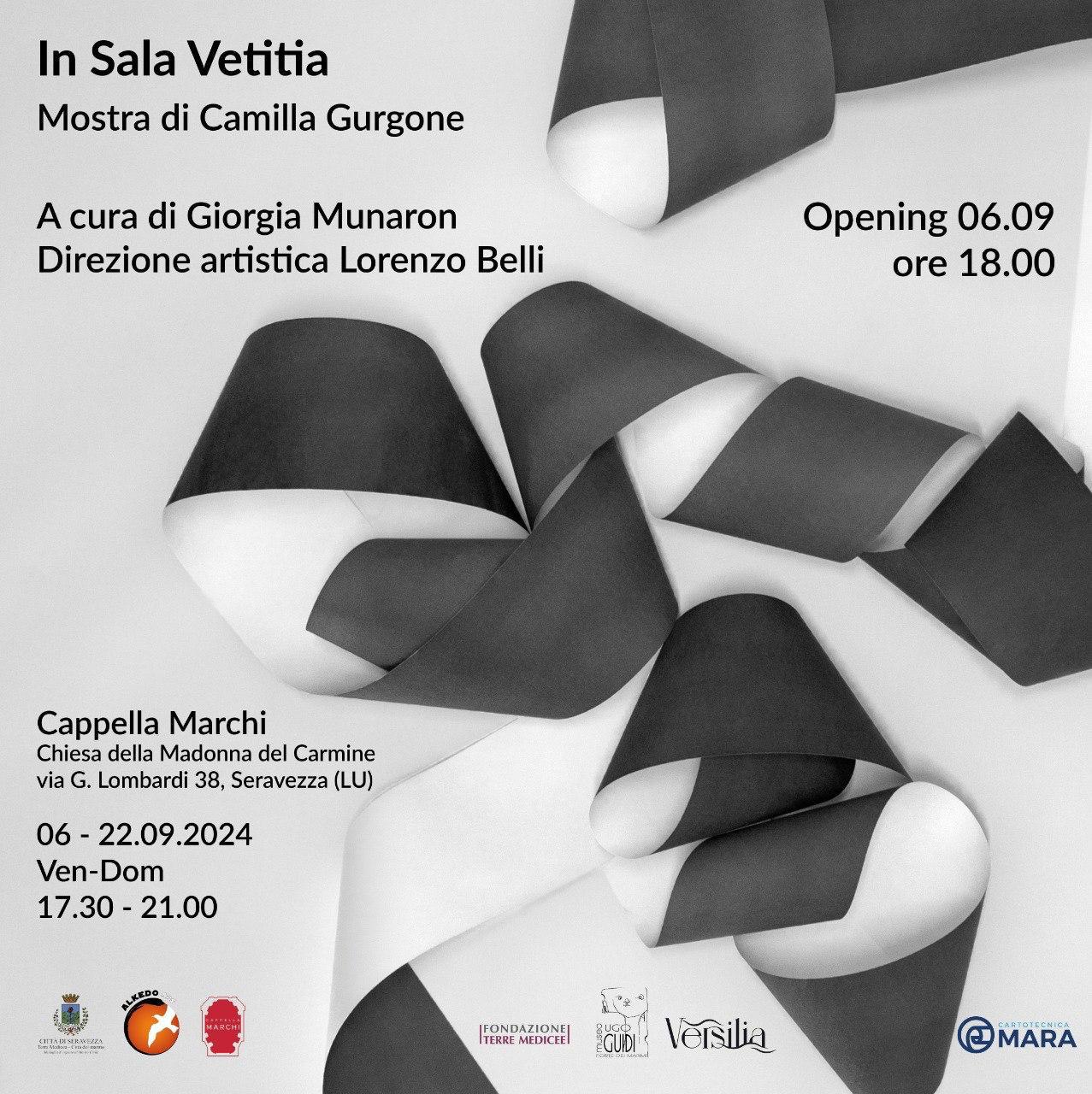 Il 6 settembre alle ore 18.00 presso lo Spazio Cappella Marchi a Seravezza (LU) inaugurerà la mostra di Camilla Gurgone “In Sala Vetitia” a cura di Giorgia Munaron, direzione artistica Lorenzo Belli.