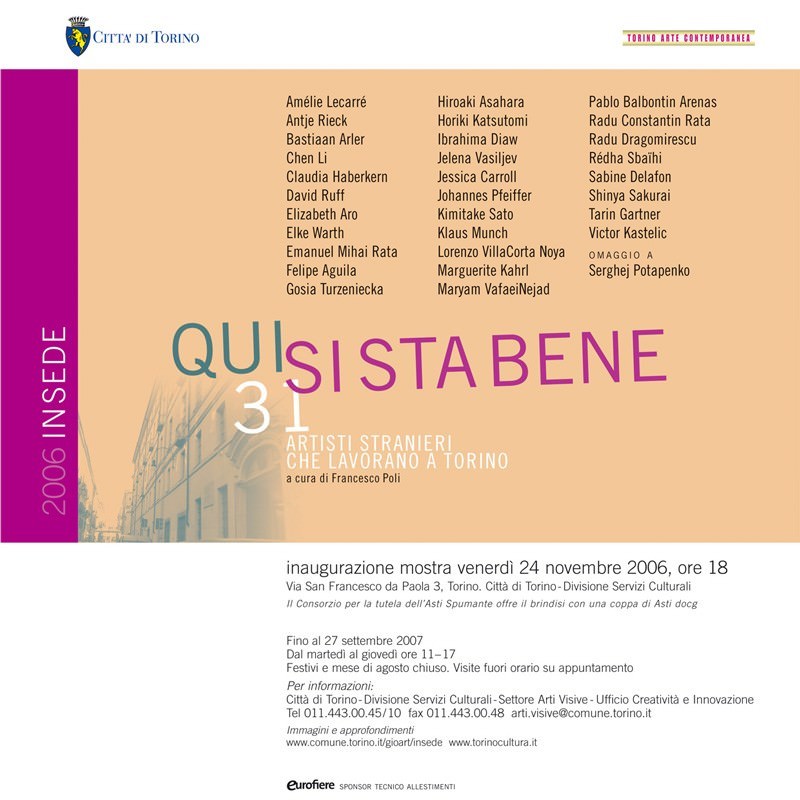 Il ciclo delle esposizioni In Sede, allestite all’interno della Vice Direzione Generale Gabinetto del Sindaco e Servizi Culturali della Città di Torino, in via San Francesco da Paola 3, prosegue così con una mostra intitolata Qui si sta bene.