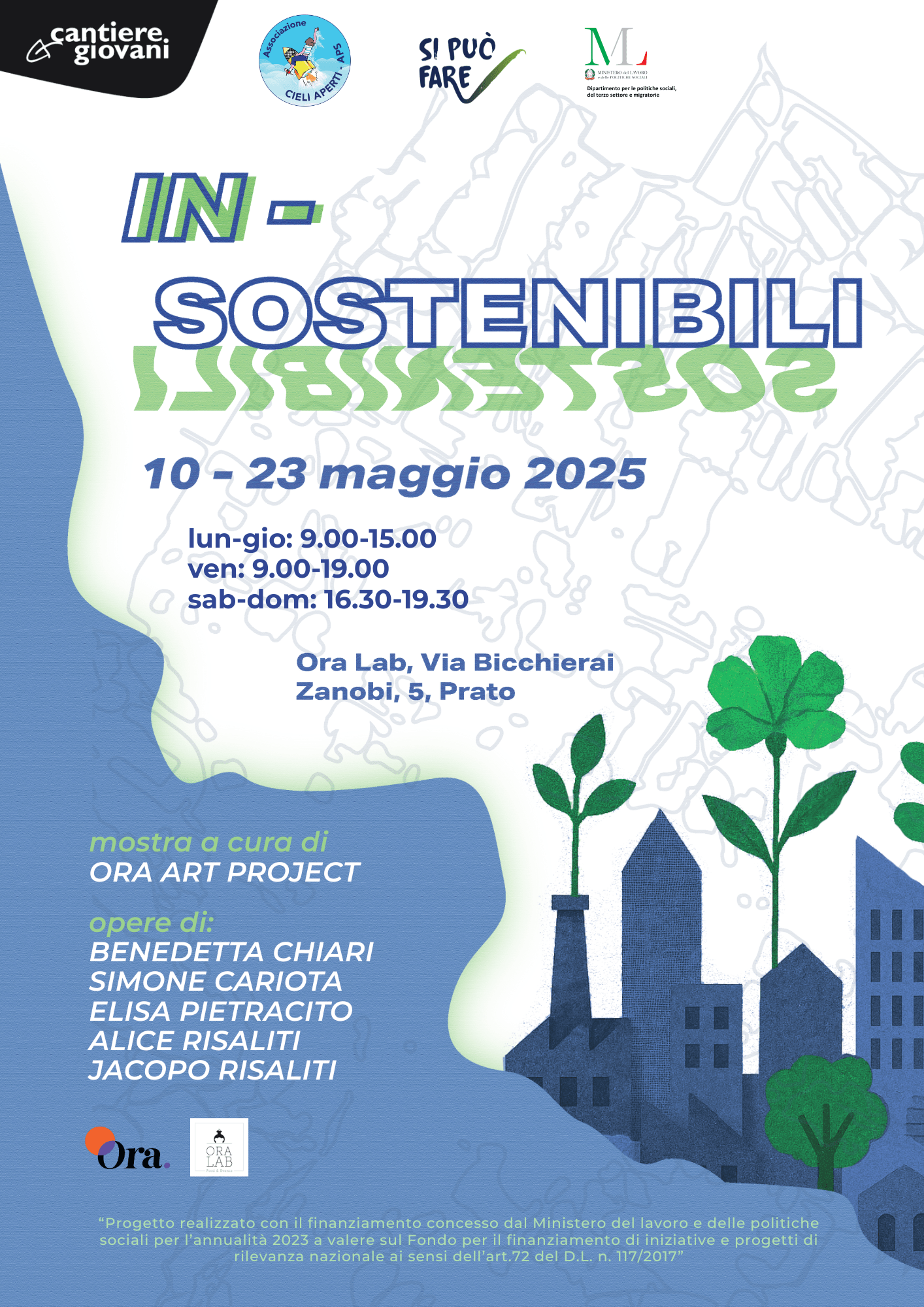 Il progetto espositivo "IN-sostenibili" è stato selezionato dall’Associazione Cieli Aperti di Prato nell’ambito del bando “Si può fare, insieme alle nuove generazioni” finanziato dal Ministero del lavoro e delle politiche sociali per l’annualità 2023 a valere sul Fondo per il finanziamento di iniziative e progetti di rilevanza nazionale ai sensi dell’art.72 del D.L. n. 117/2017. Tale progetto prosegue il percorso tracciato da Voci di Prato – Atto I e Atto II che ha indagato la città come urbs e civitas. Questa nuova tappa amplia lo sguardo verso le fragilità ambientali e sociali che ci attraversano ogni giorno.