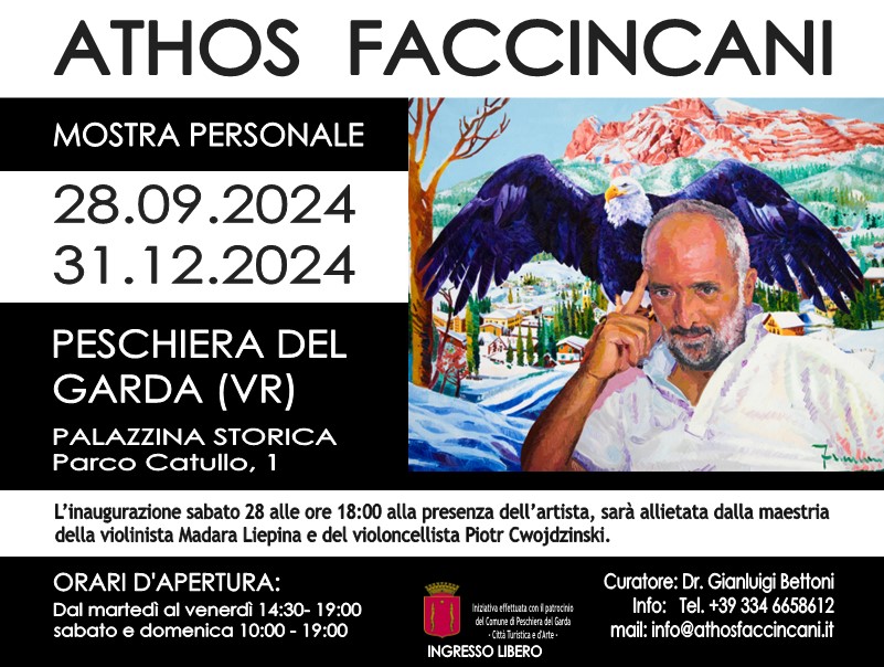 Espone da sabato 28 settembre nella Palazzina Storica di Peschiera del Garda, Athos Faccincani, artista arilicense di rara sensibilità, in grado di dare vita al buio con pennellate di poesia intensa.