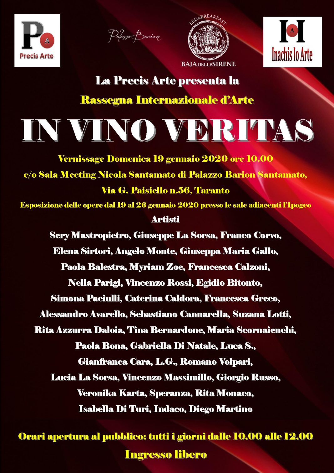 Domenica 19 gennaio 2020 alle ore 10.00 presso la sala meeting Nicola Santamato di Palazzo Barion Santamato, nel borgo antico di Taranto in via G. Paisiello n.56, ci sarà l’inaugurazione della rassegna Internazionale d’Arte “In Vino Veritas”, ideata ed organizzata dalla Precis Arte di La Sorsa Lucia. Presenti al Vernissage il dott. Arcangelo Santamato, il direttore artistico Vincenzo Massimillo, il curatore della Rassegna Lucia La Sorsa, responsabile della Precis Arte ed il poeta Antonello Vozza.
