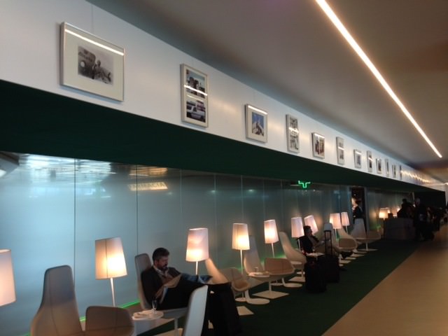 Nelle lounge Alitalia, oltre alle fotografie, sono esposti gli stemmi papali dei Pontefici che vengono applicati sulla livrea dell’aereo, vari libri sui viaggi apostolici, riviste d’epoca, le brochure con il dettaglio della rotta dei voli, i telini poggiatesta con ricamato il logo pontificio.